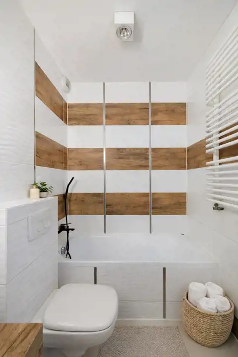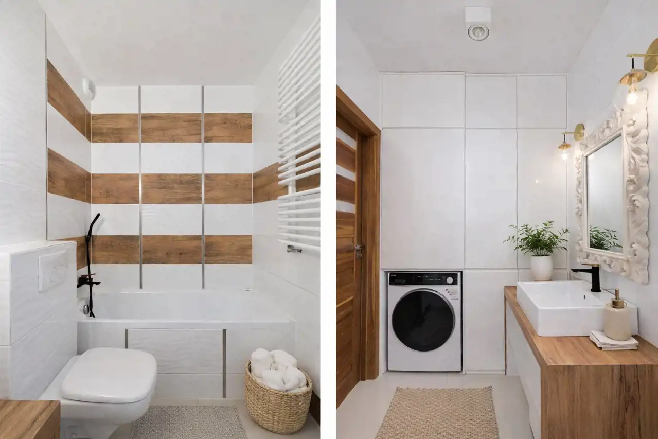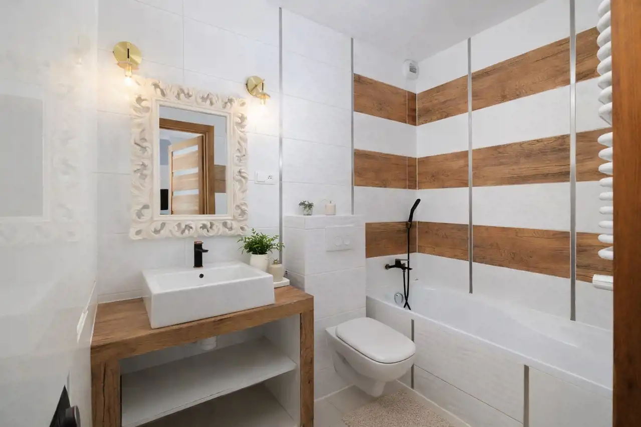 Łazienka została wykończona w nowoczesnym standardzie – jasne płytki, dekor drewna oraz czarna armatura nadają wnętrzu elegancki charakter. Wyposażona jest w wannę z funkcją prysznica oraz zabudowę meblową z miejscem na pralkę.