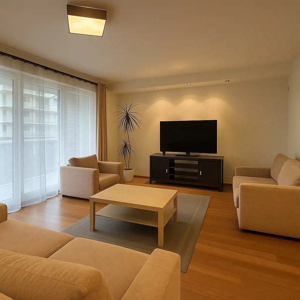 -Salon duży i przestronny wyposażony w sofę, fotel, stolik kawowy, regał RTV, TV, stół z krzesłami oraz z wyjściem na balkon.