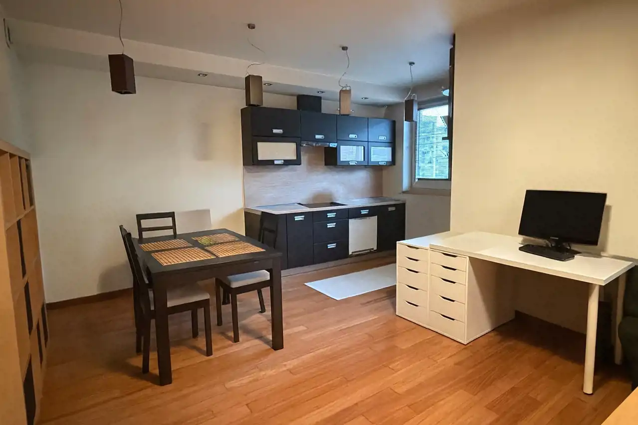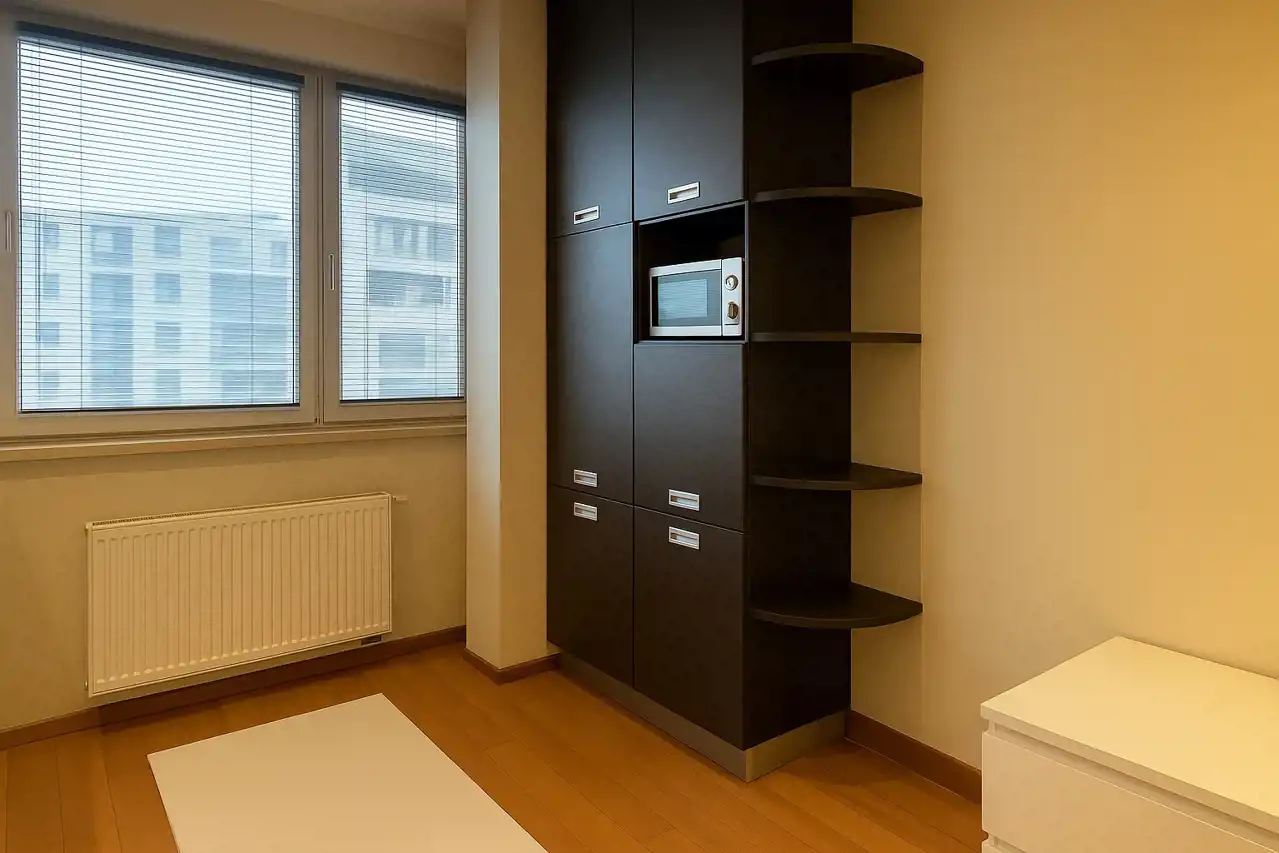 -Aneks kuchenny wyposażony w szafki, lodówko-zamrażarkę, płytę indukcyjną, mikrofalówkę, zmywarkę, okap kuchenny. Nie ma piekarnika.