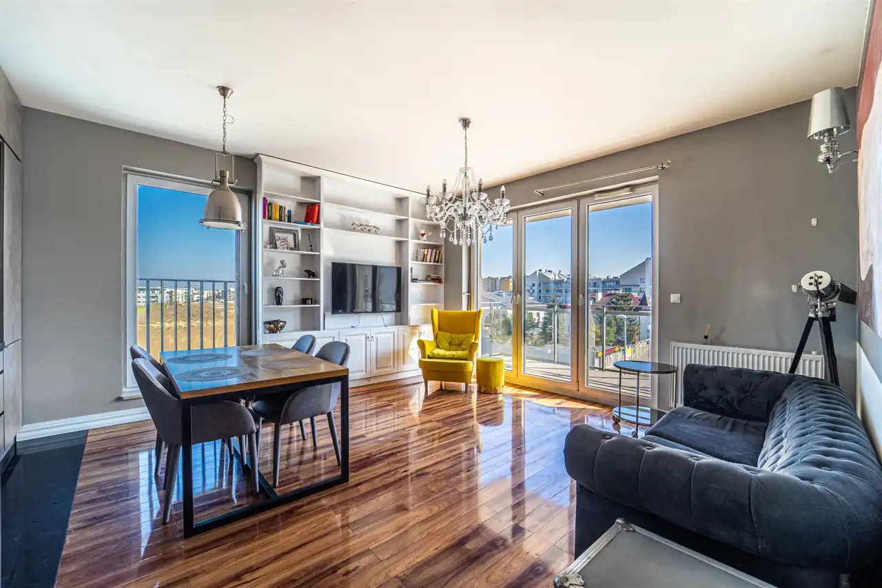 Atutami nieruchomości są duże okna na trzy strony świata – bez efektu „okno w okno”, rozległy widok na panoramę miasta, duży balkon – 12 m², liczne zabudowy zapewniające dużo miejsca do przechowywania,