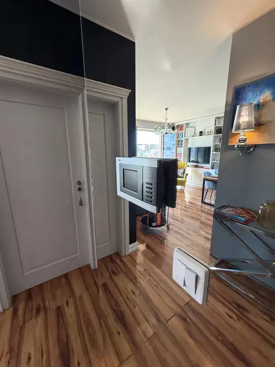 Apartament przeszedł odświeżenie i nie wymaga żadnych nakładów finansowych – jest gotowy do wprowadzenia. Z salonu oraz przestronnego balkonu (12 m²) rozpościera się widok na panoramę Warszawy, w tym na Pałac Kultury i Nauki.