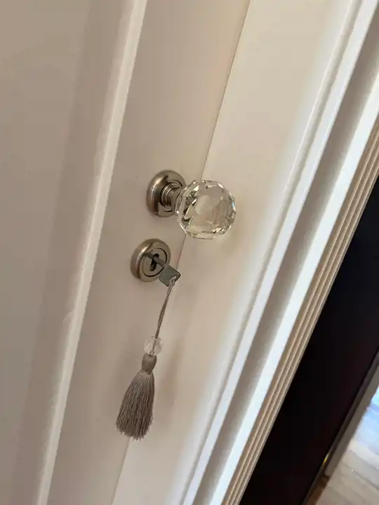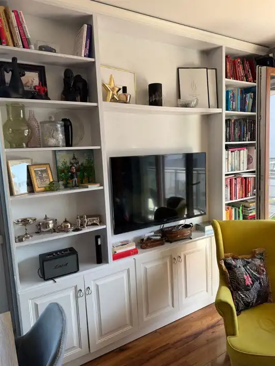 kuchnia na wymiar z pełnym zestawem AGD (płyta indukcyjna, piekarnik z funkcją mikrofali, lodówko‑zamrażarka, okap z wyciągiem, systemy cargo), łazienka z zabudową stolarską, dużym lustrem i pojemnymi szafkami, garderoba z szafami do sufitu, lustra na wymiar od podłogi do sufitu, drewniane drzwi z ozdobnymi koronami.