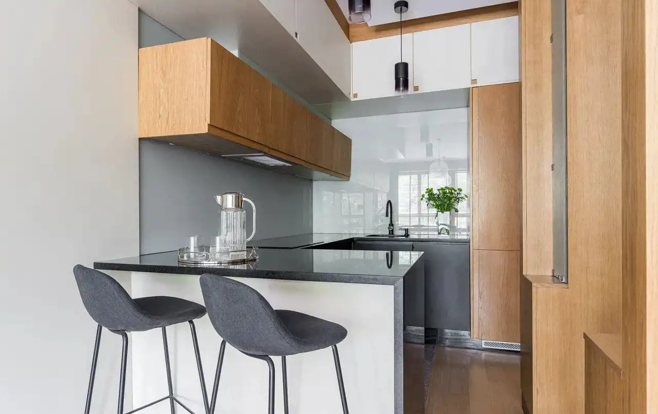 Wysokiej jakości naturalne materiały: dębowe i kamienne - podłogi, elementy stałe i meble - fornir dębowy i tek, blat kuchenny - czarny granit, czarne eleganckie drzwi wewnętrzne, nowoczesne grzejniki podłogowe.