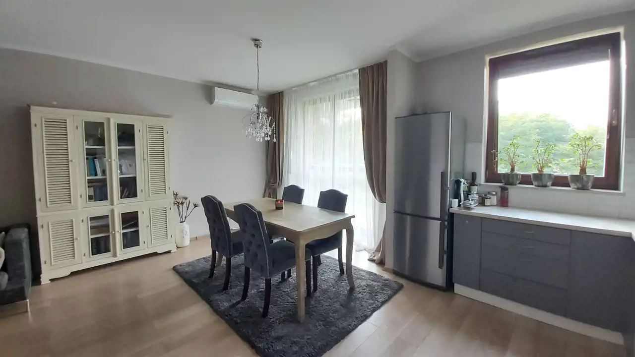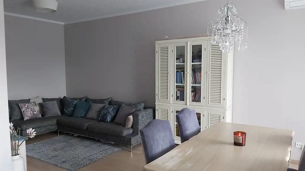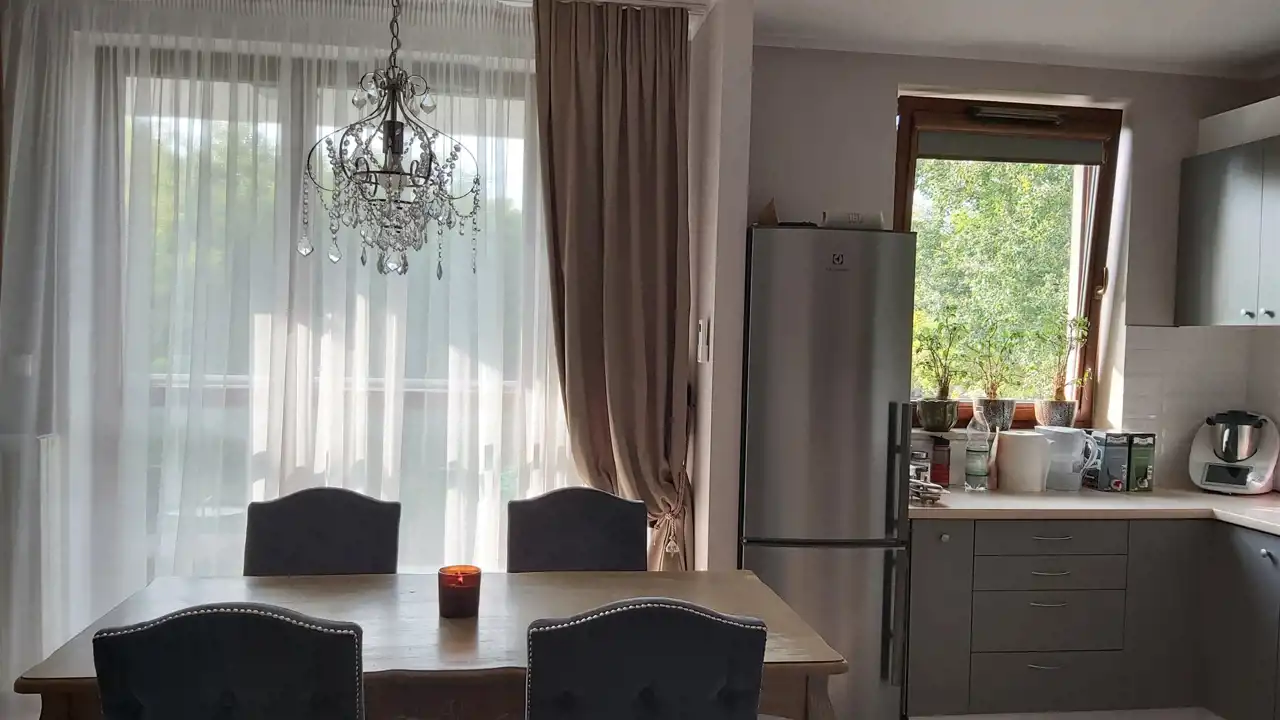 Wysokość mieszkania 270 cm, ma drewniane okna i jest wyposażone w klimatyzację.