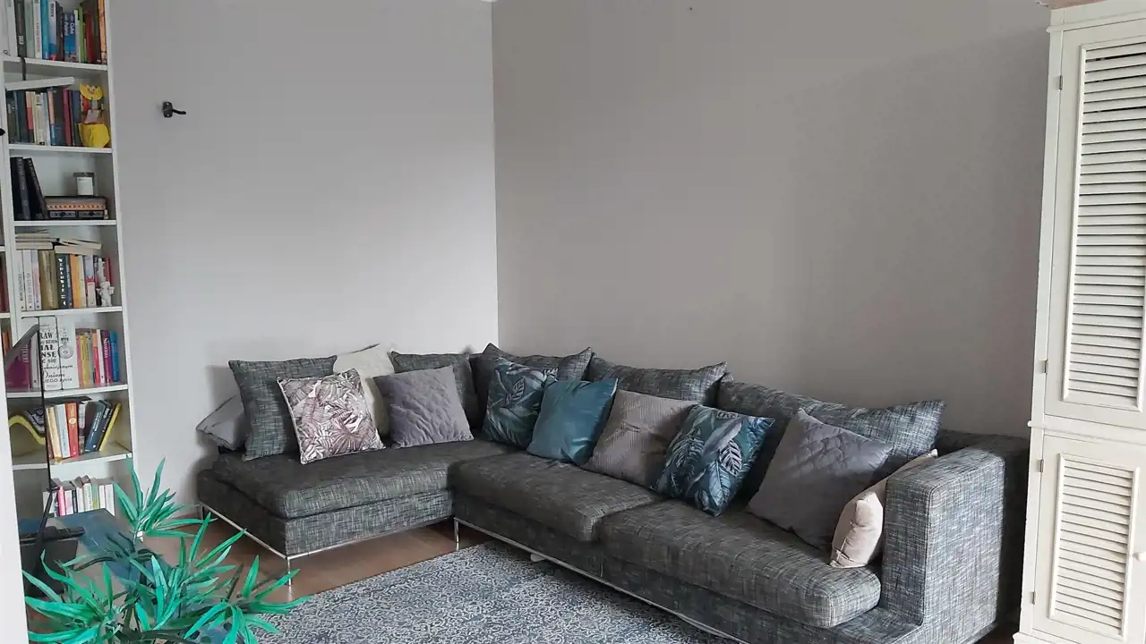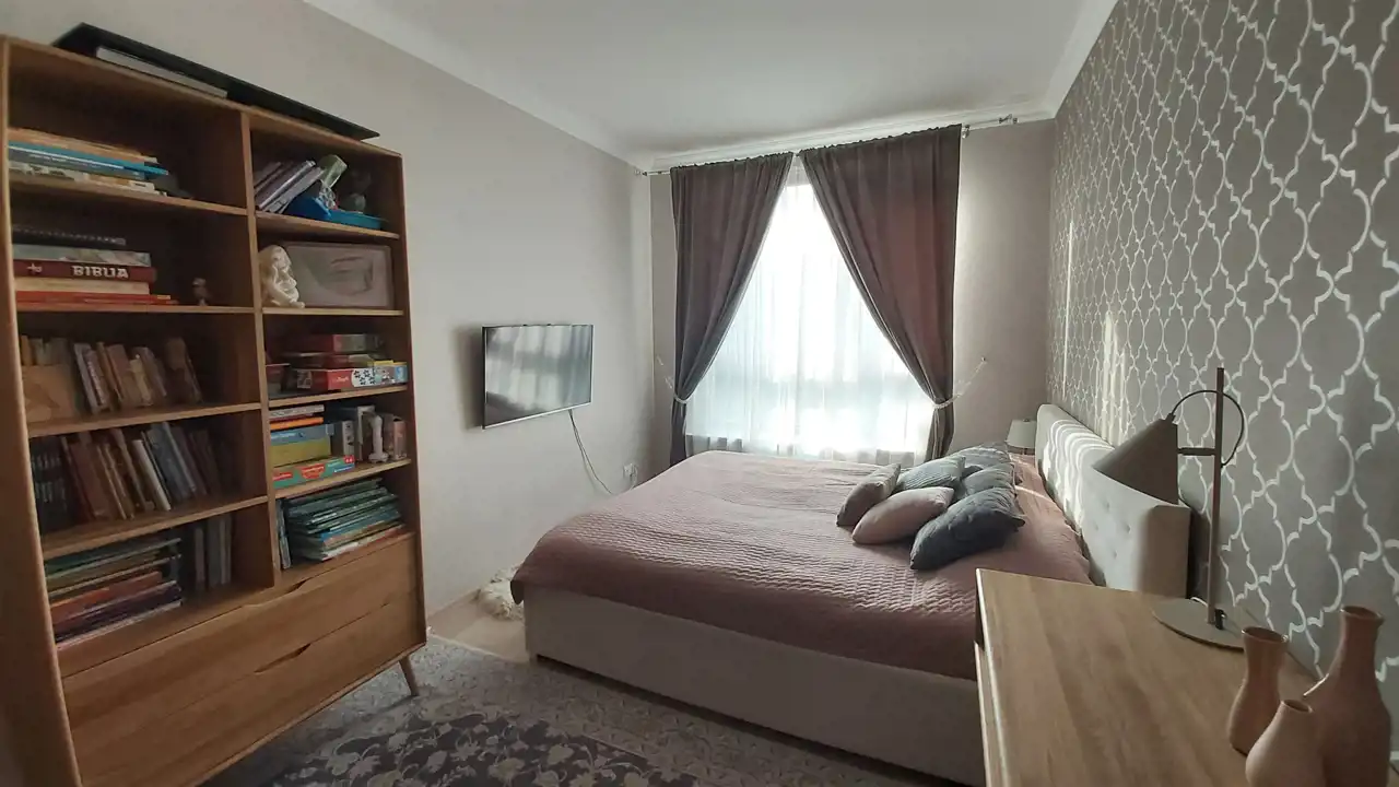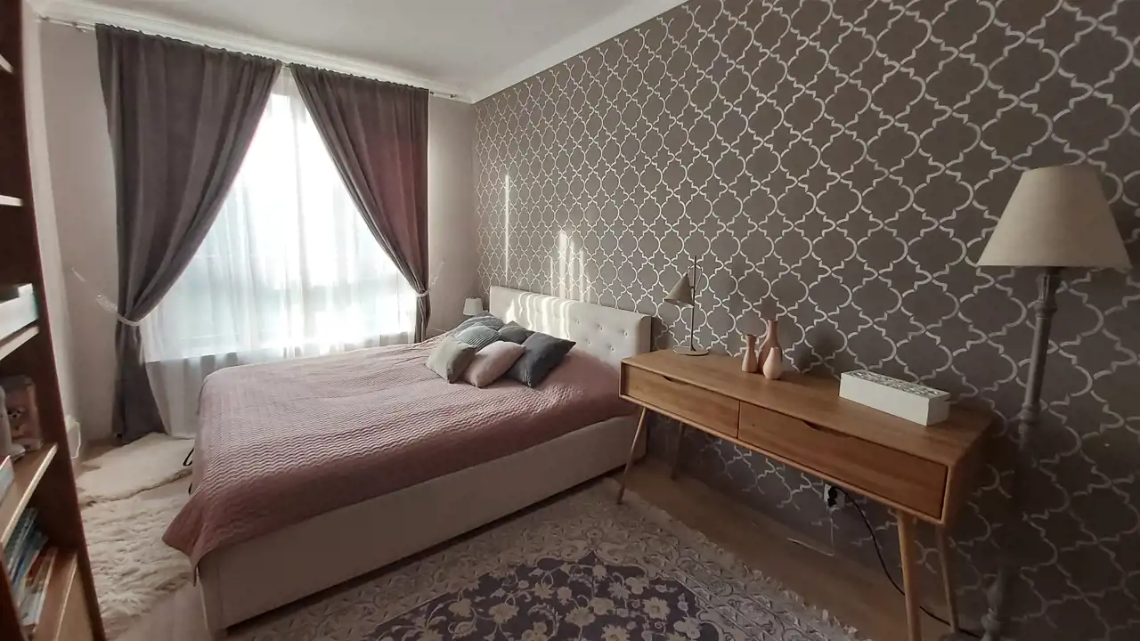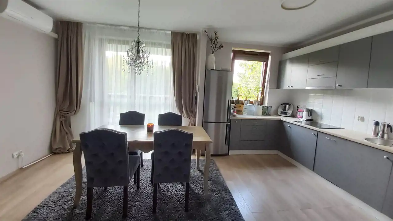 Wysokość mieszkania 270 cm, ma drewniane okna i jest wyposażone w klimatyzację.