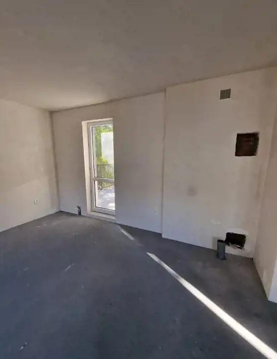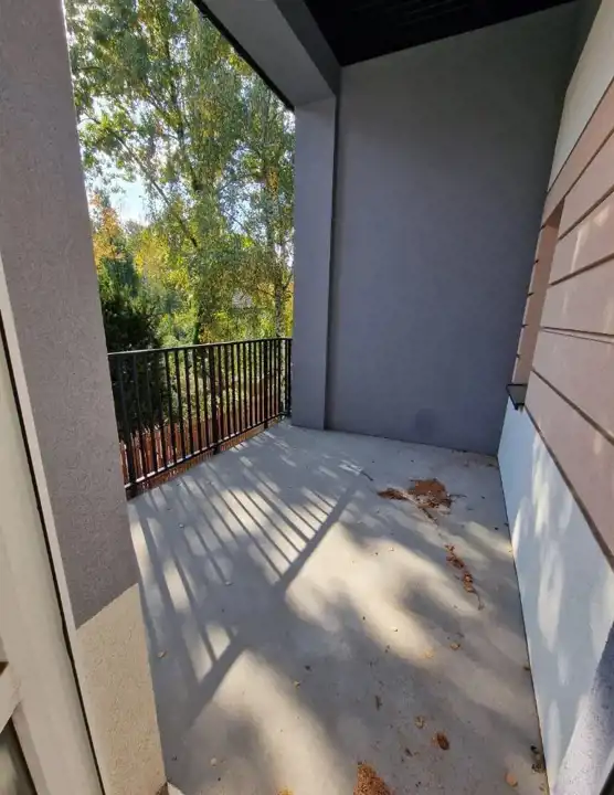 I piętro (84,16 m²): duży salon z aneksem kuchennym i wyjściem na balkon, dodatkowy taras z widokiem na ogród, łazienka, dwie sypialnie