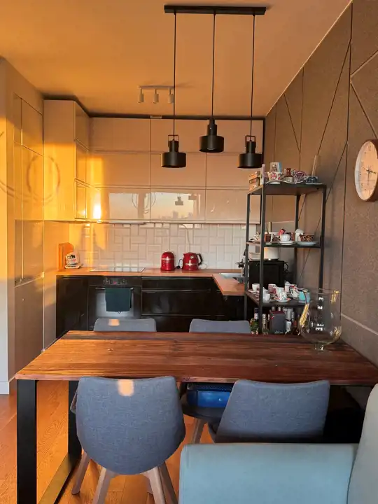 Lokal jest gotowy do wprowadzenia, wykończony w wysokim standardzie – zabudowa stolarska na wymiar, wysokiej jakości sprzęt AGD i eleganckie oświetlenie.