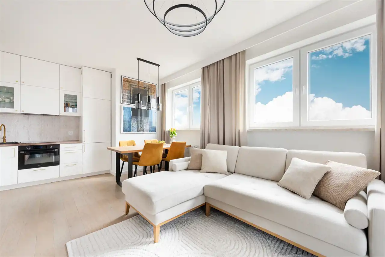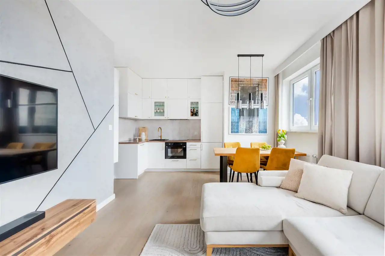 Centralną częścią jest jasny salon z aneksem kuchennym z wyjściem na duży balkon z otwartym widokiem.