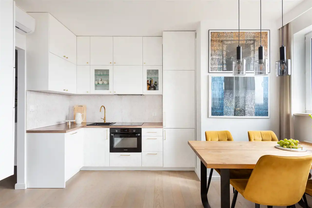 Kuchnia wykonana na wymiar, wyposażona w pełne AGD: zmywarkę, lodówkę w zabudowie, piekarnik z mikrofalą oraz okap.
