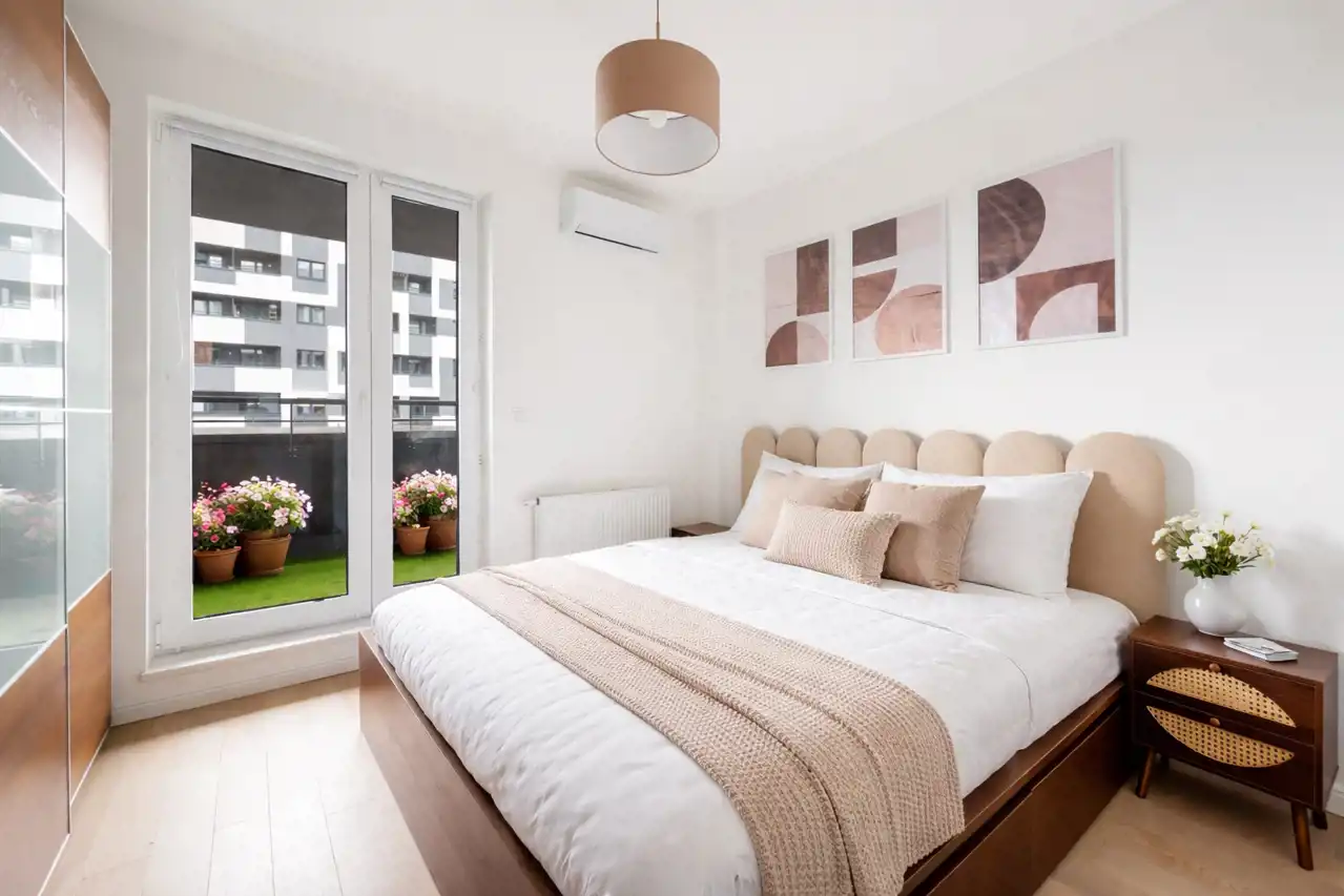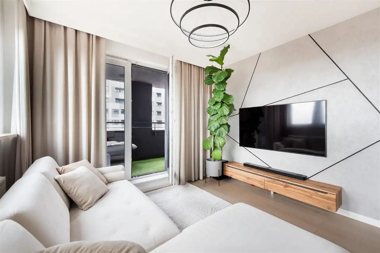 - Duży balkon z widokiem na panoramę miasta