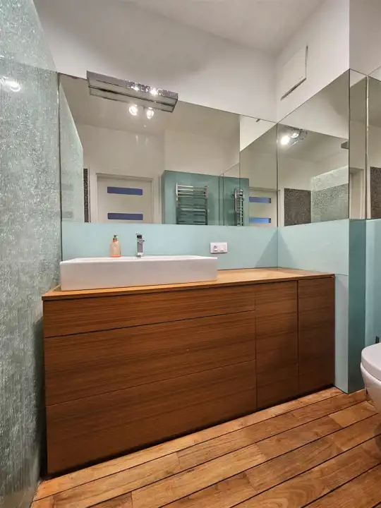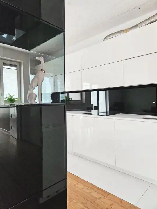 Mieszkanie funkcjonalnie zaprojektowane i wykończone w wysokim standardzie. Mieszkanie posiada wysokiej jakości meble w zabudowie wykonane na zamówienie, drewniane podłogi (parkiet egzotyczny, w łazience teak), ergonomiczną kuchnię wyposażoną w sprzęty znanych marek.