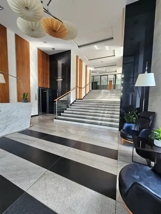Nowoczesny budynek mieszkalny na prestiżowym osiedlu Saska, z całodobową ochroną i recepcją. Osiedle z lokalami handlowo - usługowymi na parterze, położone na granicy Saskiej Kępy i Gocławia. Projekt deweloperski zrealizowano w 2012 roku przez Dom Development - znanego i cenionego na rynku dewelopera.