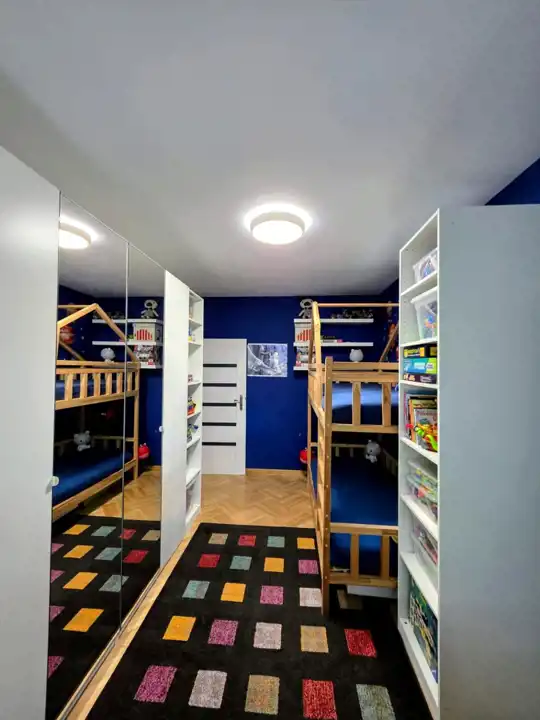 - 2 pokoi (aktualnie jeden to pokój dla dzieci, drugi to sypialnia z miejscem do pracy),