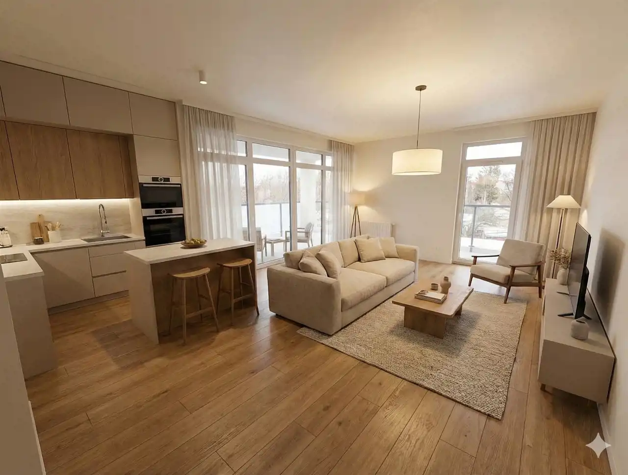 Przestronny salon z widną kuchnią (23 m2) tworzący otwartą przestrzeń do życia.