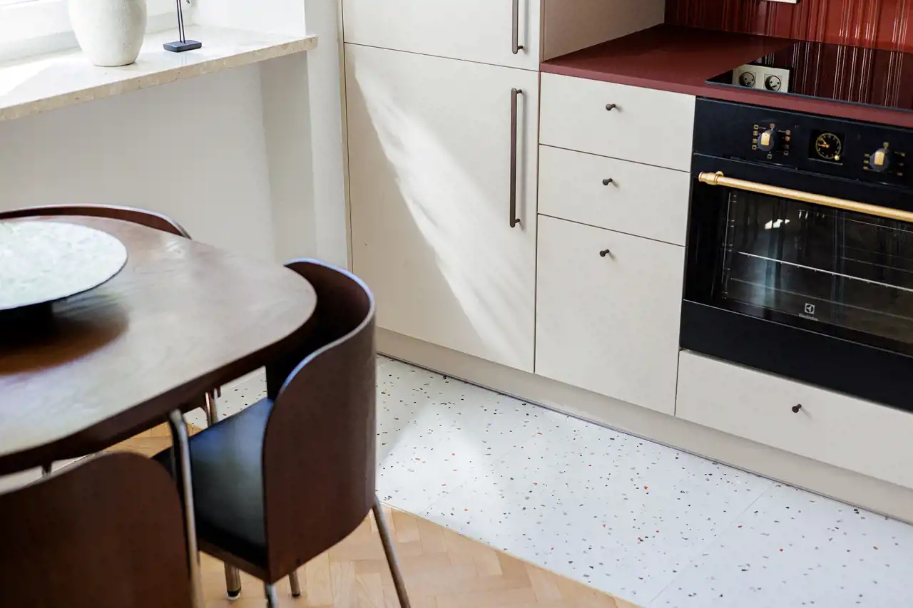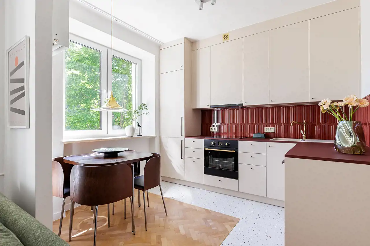 W kuchni znajdziemy robioną na wymiar stolarkę i nowiutki sprzęt AGD dobrych marek (Electrolux, Bosch, Samsung). Lodówka, zmywarka i pralka są w zabudowie. A posiłki będą celebrowane w towarzystwie Ikea Fusion - ikony designu z lat 90ych.