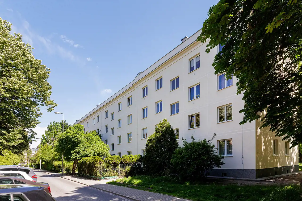 Wiktorska 86. Elegancki i zadbany 4-ro piętrowy budynek z początku lat 50-tych, który właśnie przeszedł remont elewacji.