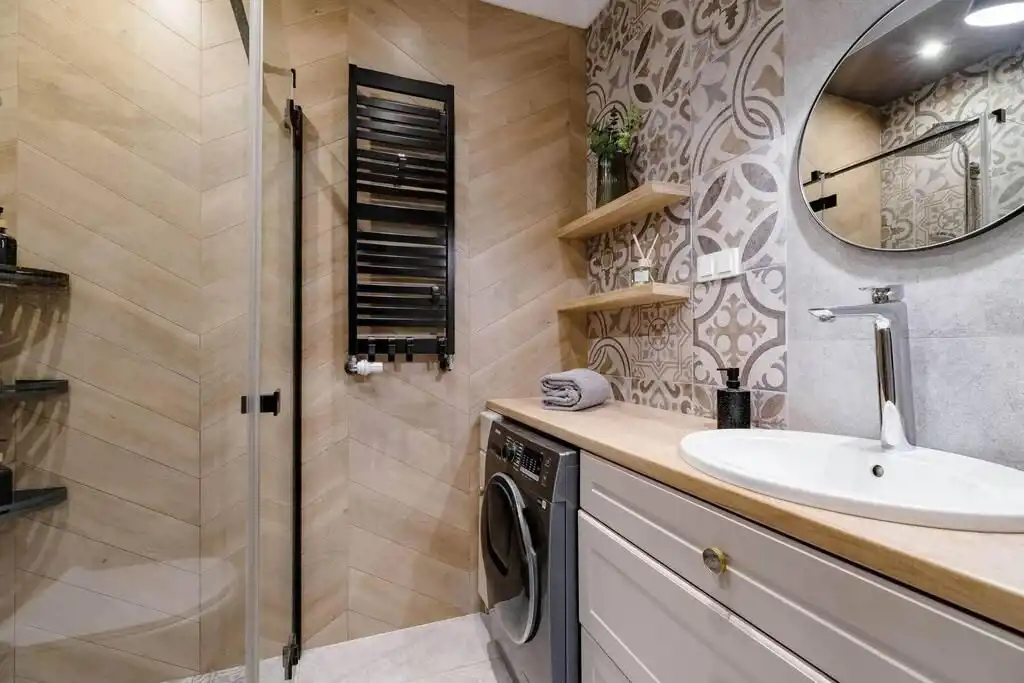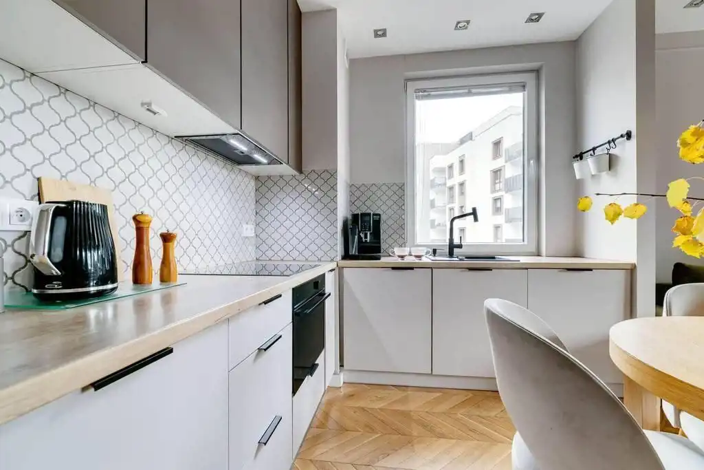 Na podłogach drewniany parkiet i płytki, zabudowy w całym mieszkaniu robione na zamówienie, w oknach moskitiery robione na zamówienie, drewniana podłoga na balkonie, drzwi antywłamaniowe, lodówka, zmywarka, piekarnik, płyta indukcyjna, okap, pralka, zabudowy na wymiar.