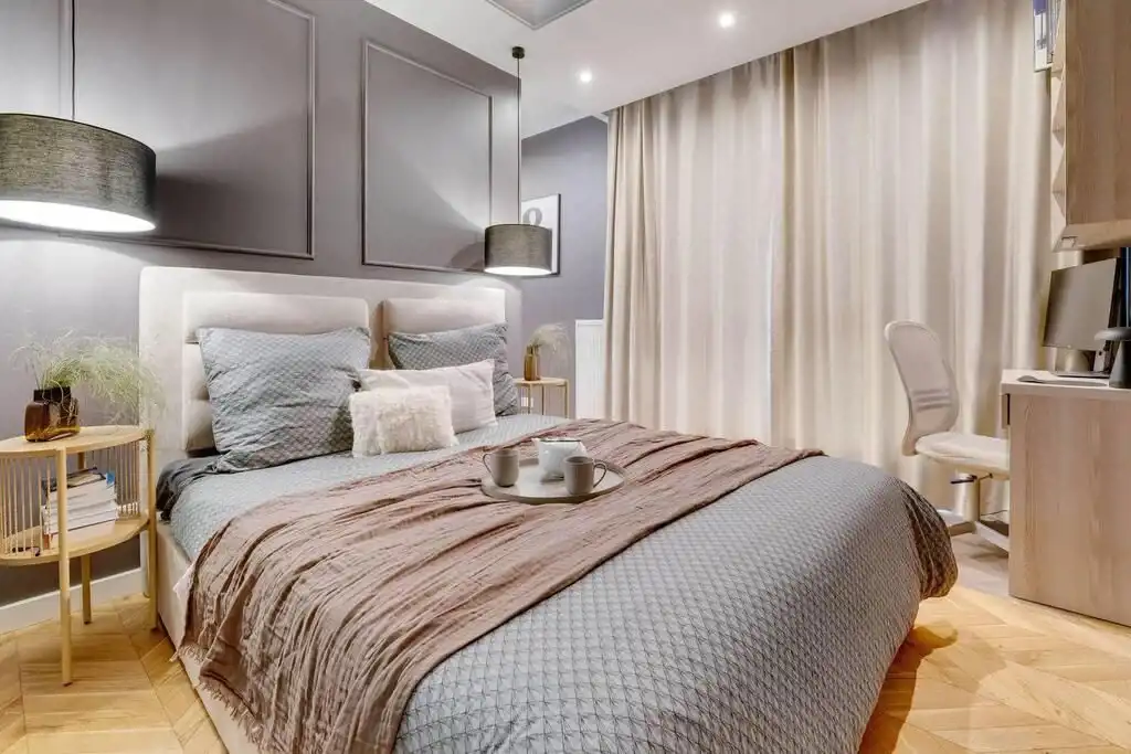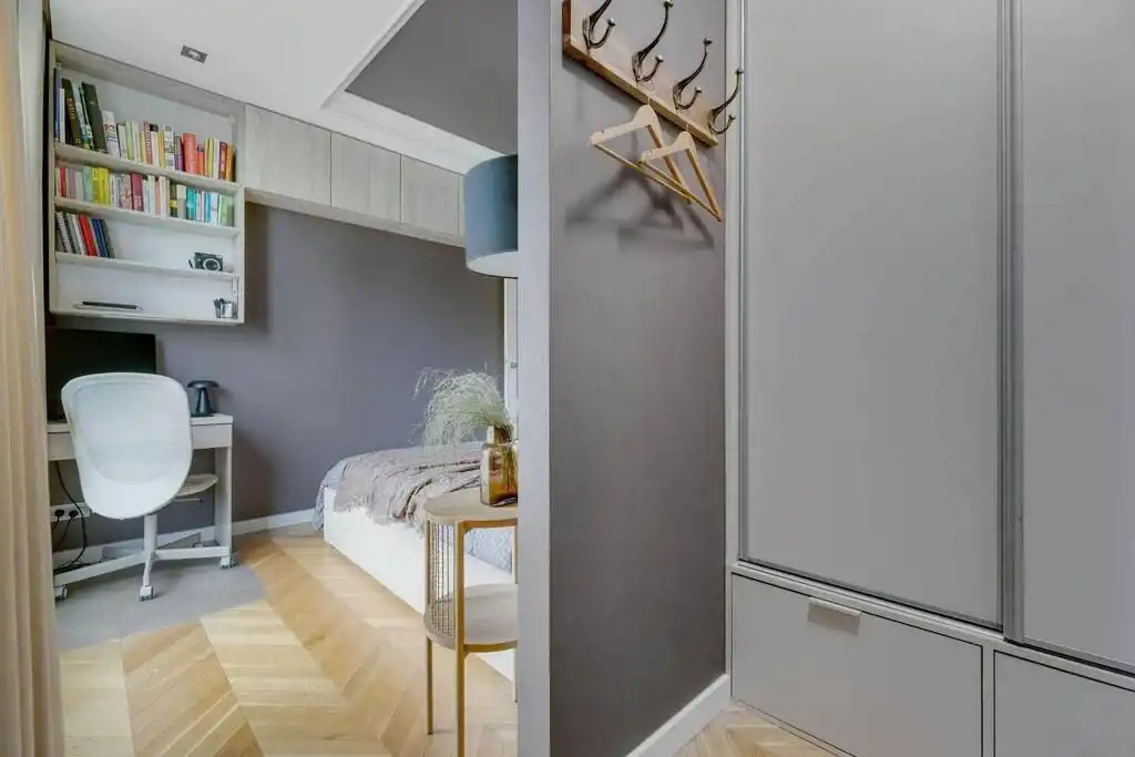 - Sypialnia I z miejscem do pracy i garderobą – 14,82 m²