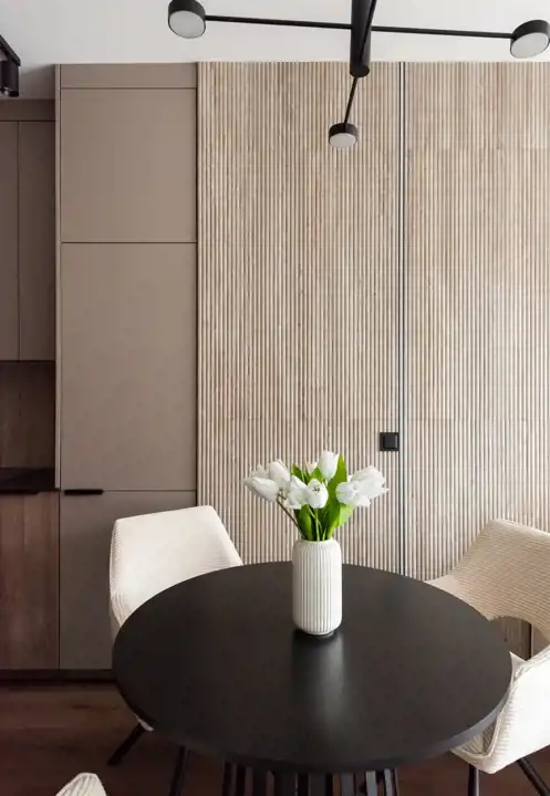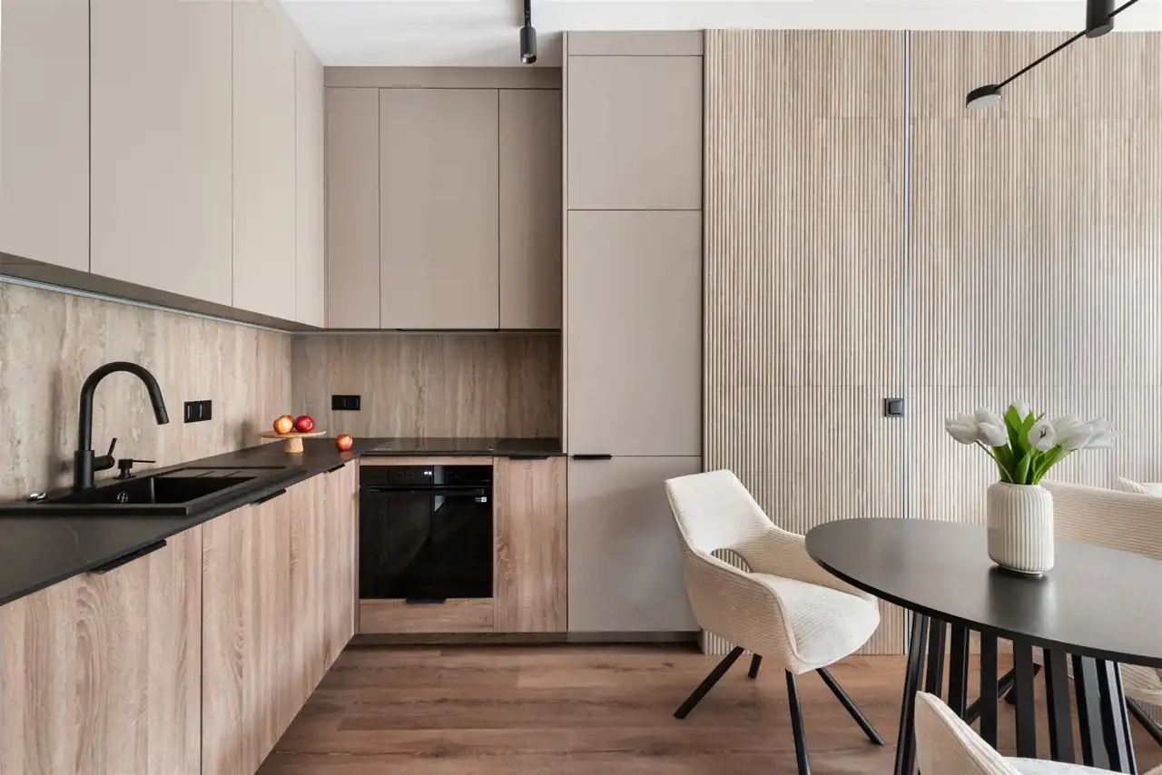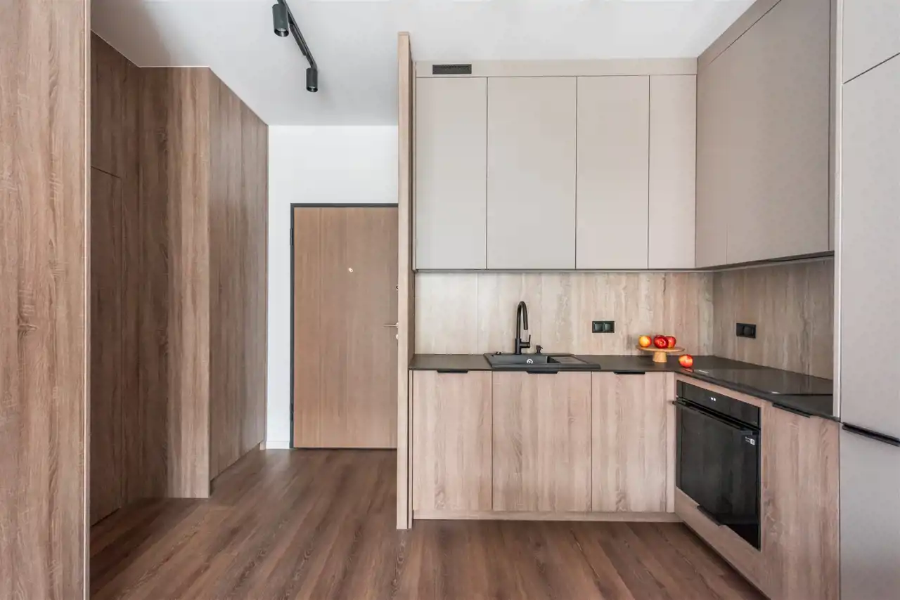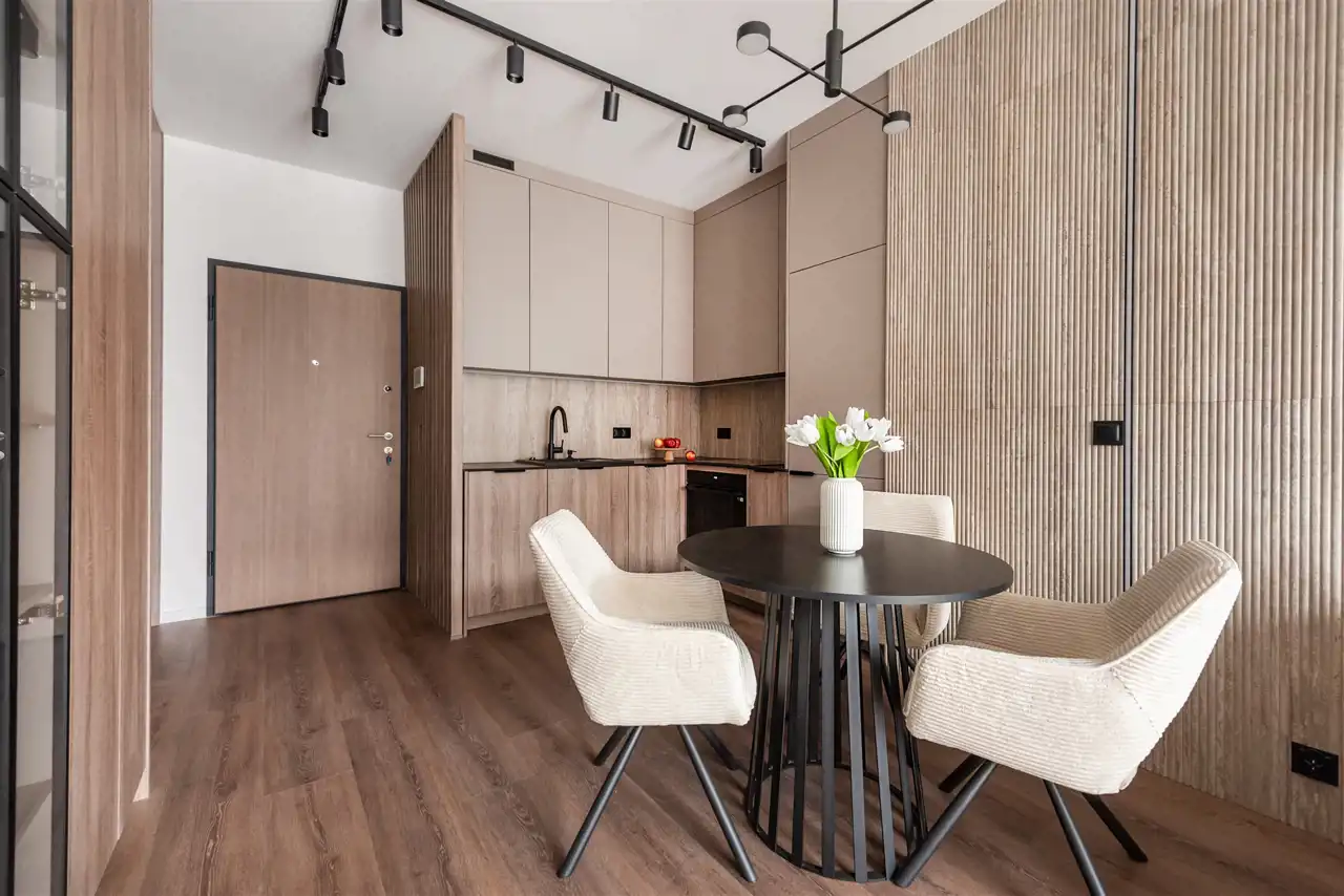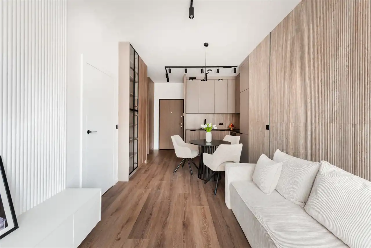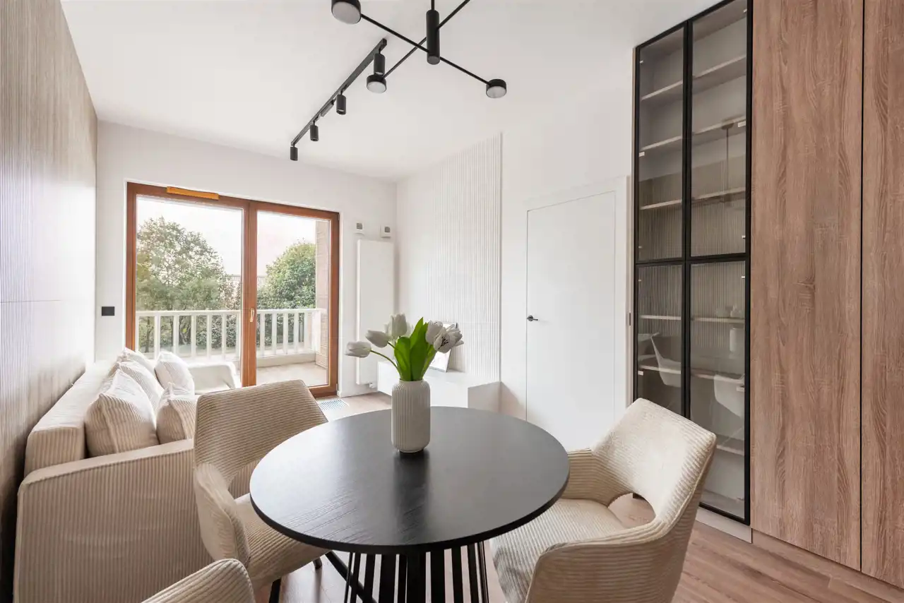 • Przestronny Salon z Aneksem kuchennym: Otwarta przestrzeń o powierzchni 19,00 m² stanowi serce mieszkania. Salon wyposażono w wygodną sofę z funkcją spania, idealną do relaksu, szafkę rtv oraz zabudowę meblową dopełniającą aranżację wnętrza. Aneks kuchenny oferuje wiele miejsca do przechowywania i został zaprojektowany z myślą o funkcjonalności. Na wyposażeniu znajdują się: lodówko-zamrażarka, płyta indukcyjna, piekarnik, okap oraz zmywarka. Stół z krzesłami idealnie wpasowuje się w przestrzeń między aneksem a salonem. Kuchnia jest jasna, przestronna i ergonomiczna.