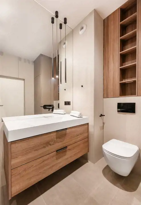• Łazienka pełna komfortu: Nowoczesna łazienka o powierzchni 5,29 m² została wyposażona w przestronny prysznic typu walk-in, duże lustro, toaletę oraz umywalkę z dużą szafką. Dodatkową wygodę zapewnia zabudowa meblowa, w której znajdziemy miejsce na pralkę oraz sporo miejsca do przechowywania.