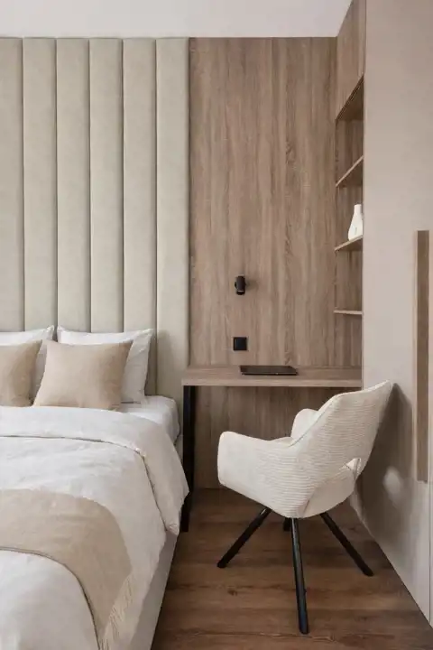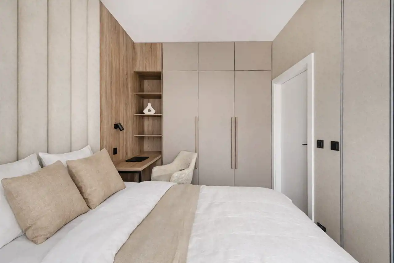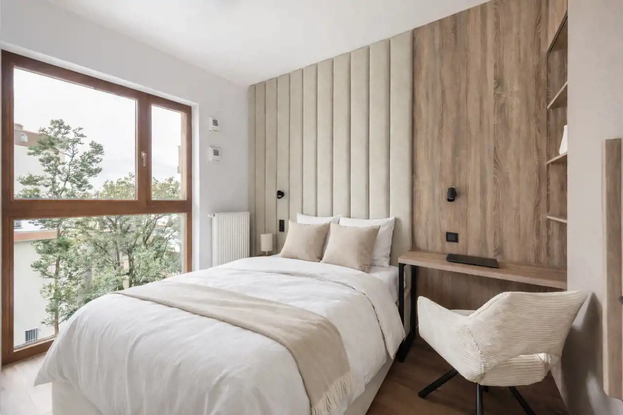 • Stylowa Sypialnia: Sypialnia o powierzchni 9,28 m² to przytulne miejsce do odpoczynku z wydzielonym miejscem do pracy. Duże okna zapewniają naturalne światło przez większą część dnia, a komfortowe łóżko o wymiarach 140x200, gwarantuje spokojny sen i pełen relaks. Znajdziemy tu również duża szafę w zabudowie, która zapewnia wygodę i funkcjonalność, nie zaburzając estetyki wnętrza.
