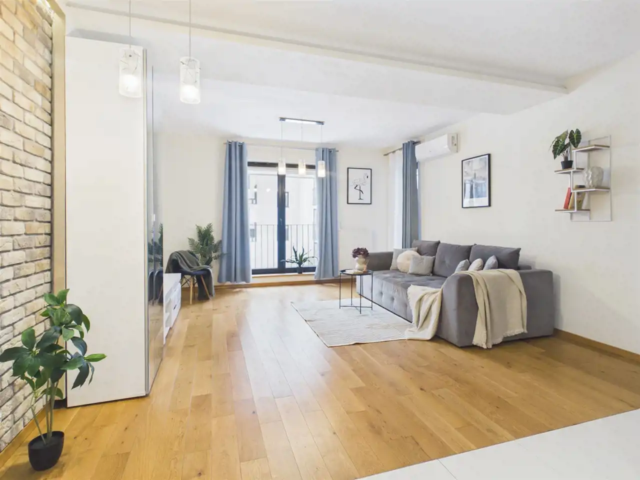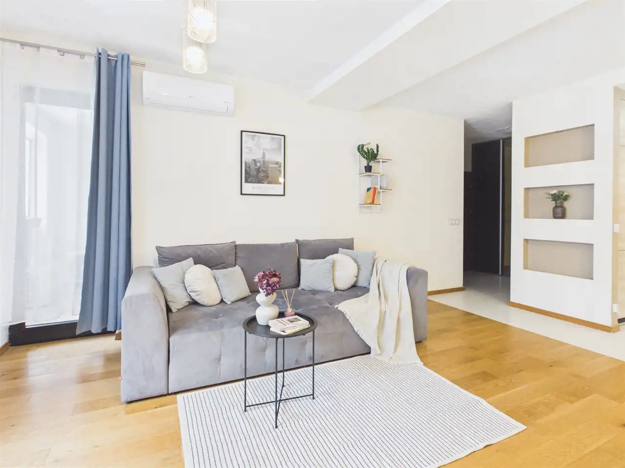 - Air conditioning throughout the apartment (separate units in the living room and bedroom)