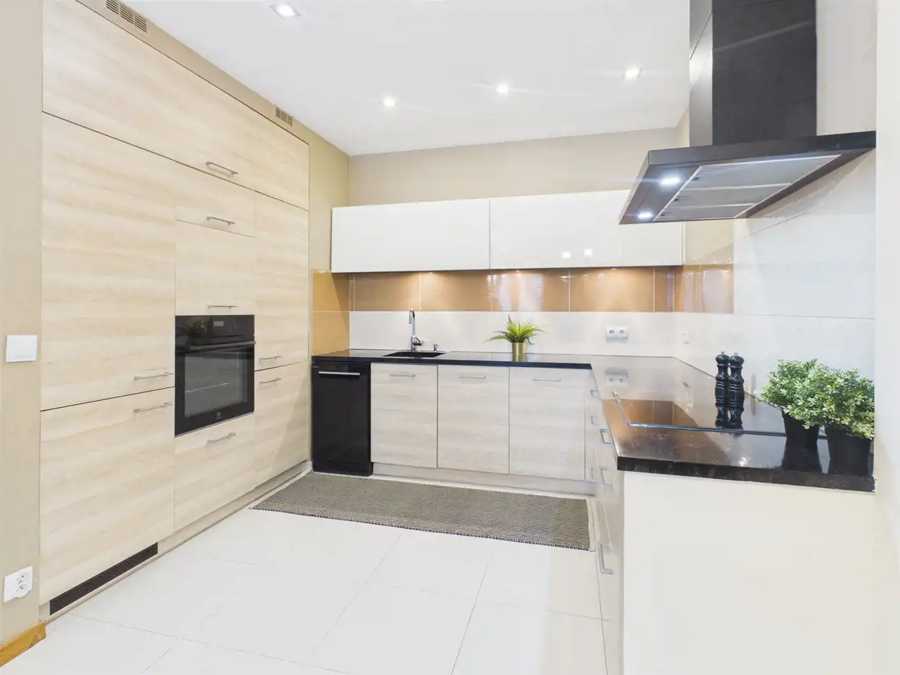 - Przestronny salon z aneksem kuchennym w pełnej zabudowie (kamienny blat oraz kamienny zlew, sprzęty: płyta indukcyjna, zmywarka, piekarnik, okap, pralka)