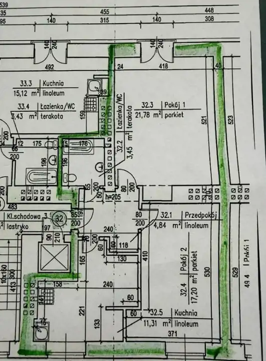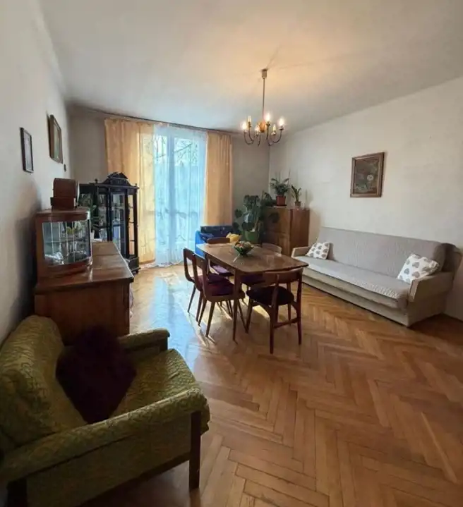 W mieszkaniu jest oryginalny dębowy parkiet do odświeżenia oraz 4 wnęki do szaf w zabudowie.