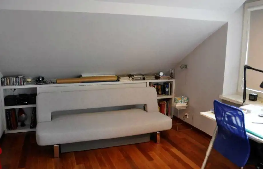 Poziom II: 2 sypialnie, łazienka z oknem, z dużą okrągłą wanną, oraz pralnio/prasowalnio/suszarnia, duży hall z oknami, spełniający rolę saloniku z miejscem do pracy oraz z dużym TV i kanapą. Do mieszkania przynależy: garaż płatny dodatkowo 40 tyś zł, piwnica około 25,5 m, zagospodarowany ogródek o powierzchni 245 m.