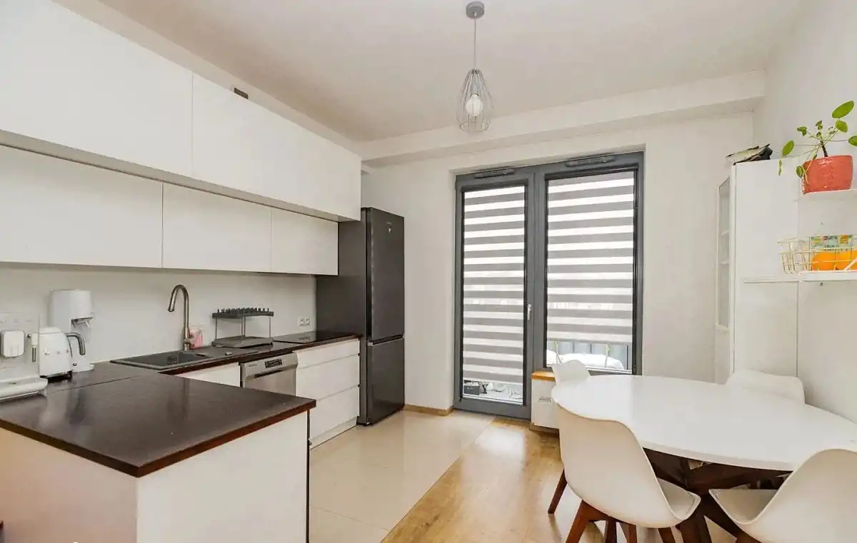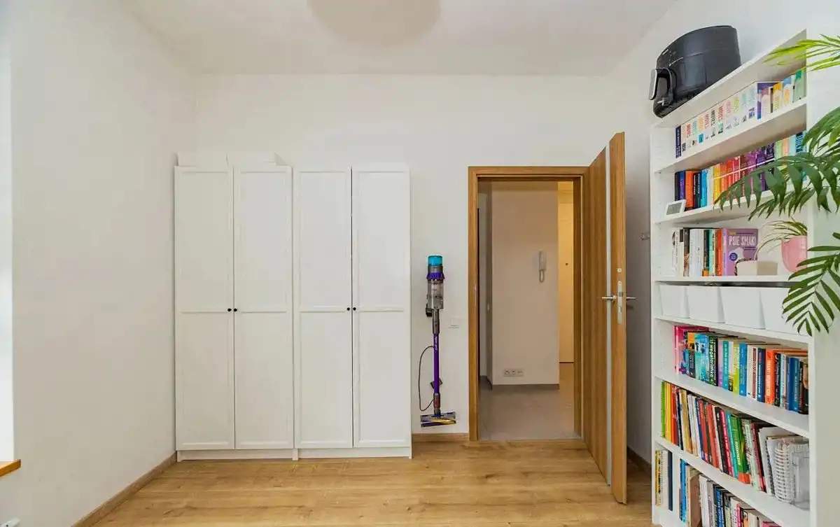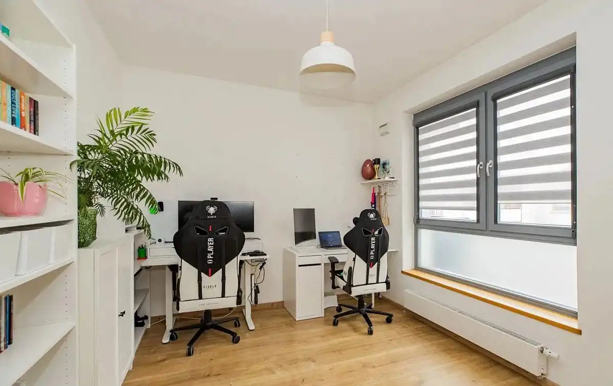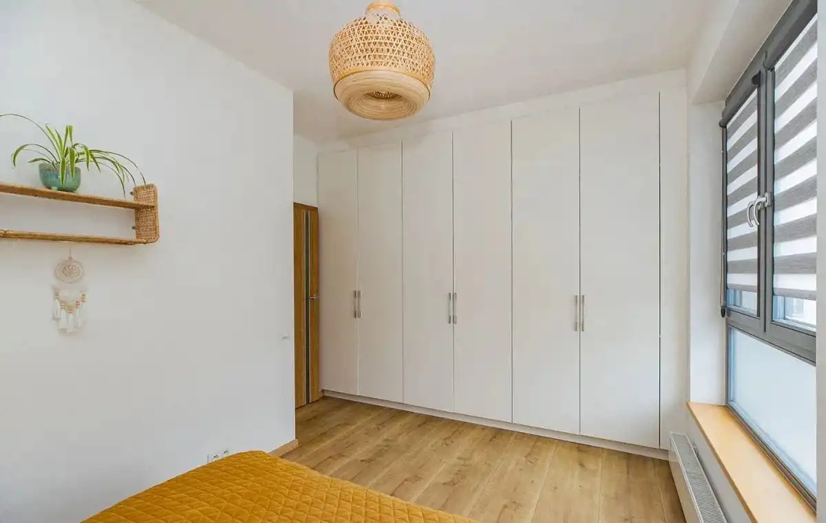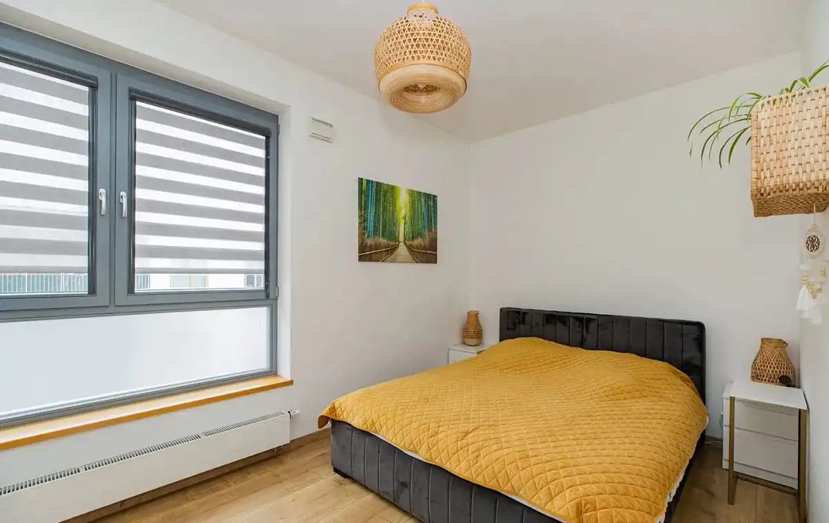 Mieszkanie dwustronne: widny salon z aneksem kuchennym, balkon z widokiem na zielone patio od strony południowej, a obie sypialnie od północnej. Funkcjonalny rozkład pomieszczeń. Pokoje są bardzo ustawne, o zbliżonym metrażu. Sypialnia master z szafą na wymiar w zabudowie. Druga może posłużyć jako pokój dla dzieci lub gabinet. Apartament jest bardzo zadbany i wykończony naturalnymi, bardzo dobrymi jakościowo materiałami.