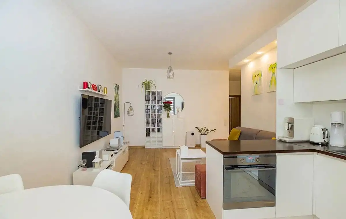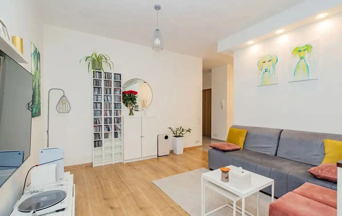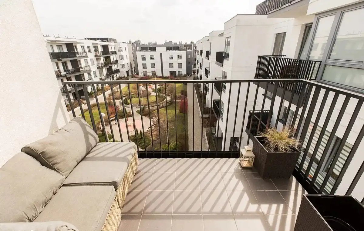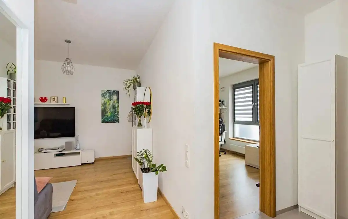 Mieszkanie dwustronne: widny salon z aneksem kuchennym, balkon z widokiem na zielone patio od strony południowej, a obie sypialnie od północnej. Funkcjonalny rozkład pomieszczeń. Pokoje są bardzo ustawne, o zbliżonym metrażu. Sypialnia master z szafą na wymiar w zabudowie. Druga może posłużyć jako pokój dla dzieci lub gabinet. Apartament jest bardzo zadbany i wykończony naturalnymi, bardzo dobrymi jakościowo materiałami.