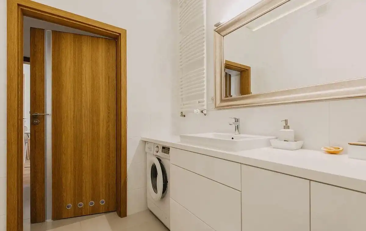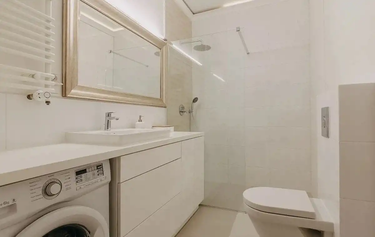 Jasna i duża łazienka z zabudową pod wymiar i wygodnym prysznicem.