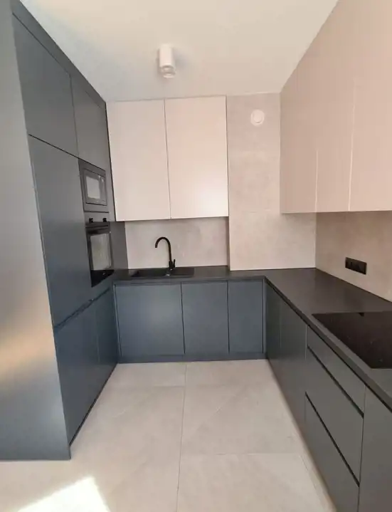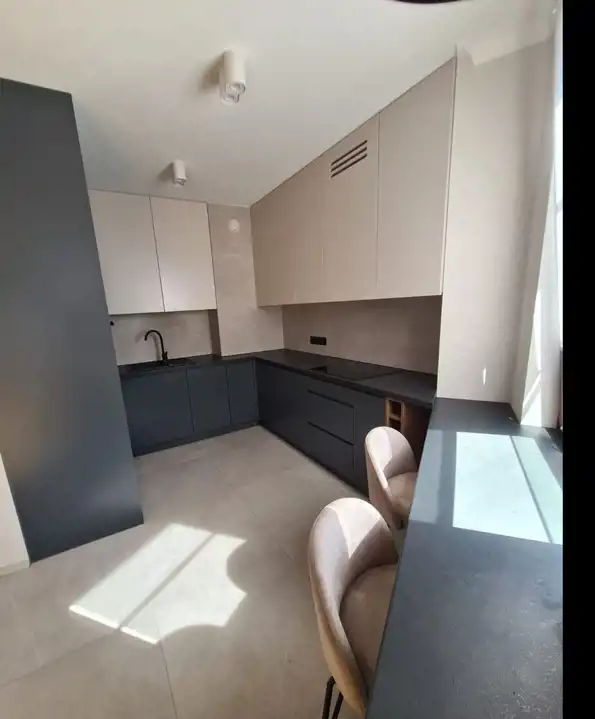 W kuchni znajdziemy pełne wyposażenie oraz wszystkie potrzebne sprzęty AGD: zmywarkę, lodówkę płytę indukcyjną w zabudowie, a także blat z taboretem w kuchni.