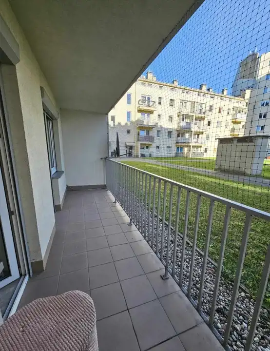 - Jest na pierwszym piętrze, ale od wewnątrz osiedla (zamkniętego) balkon jest na poziomie wewnętrznego patio, co jest idealne pod kątem dzieci lub zwierząt.