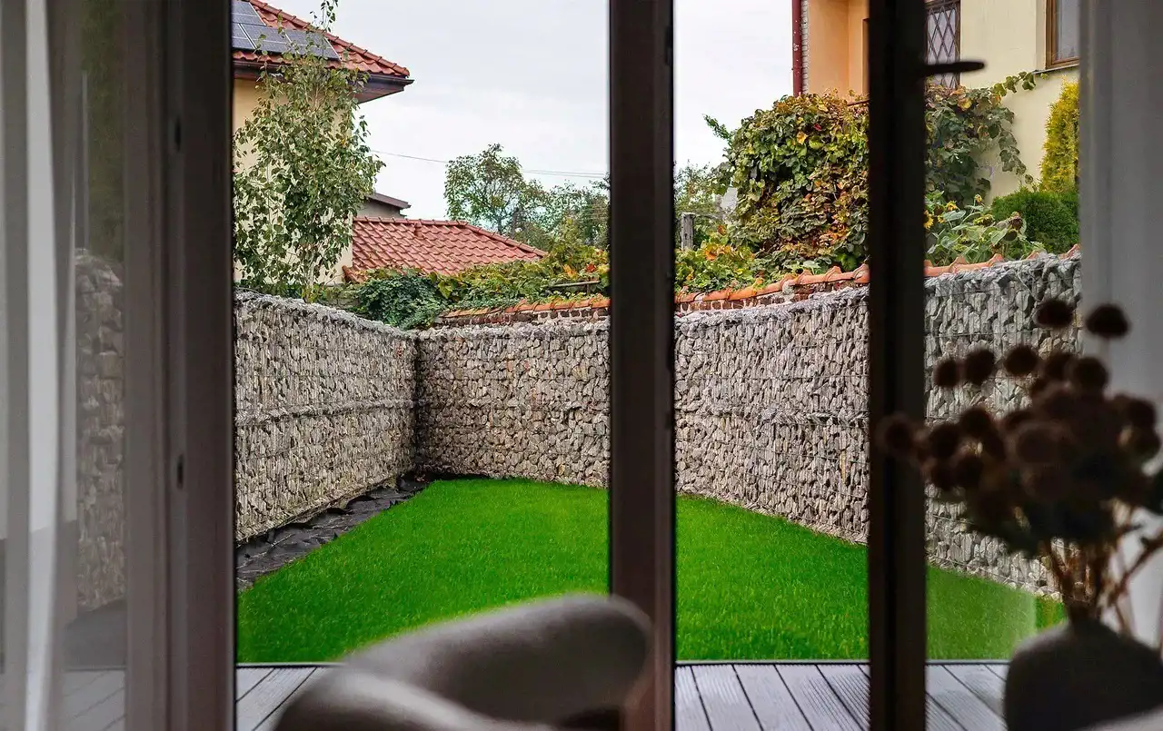 Z salonu wychodzi się bezpośrednio do prywatnego ogródka (ok. 30 m²) – idealnego na poranną kawę, plac zabaw dla dzieci lub weekendowe grillowanie.