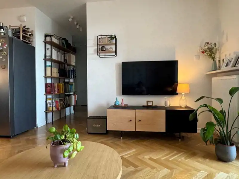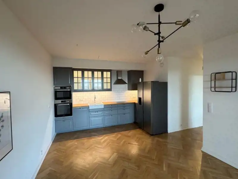 • Salon z aneksem kuchennym z pełnym wyposażeniem: szafki IKEA METOD, blat drewniany dębowy. Sprzęty marki Samsung (duża lodówka z kostkarką, piekarnik, płyta indukcyjna, mikrofala, zmywarka).