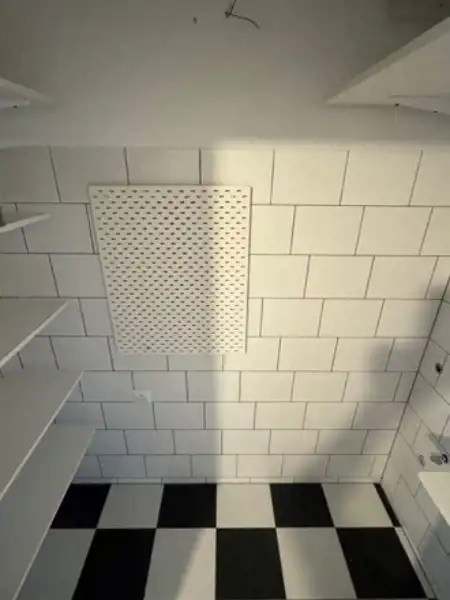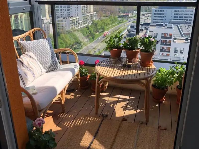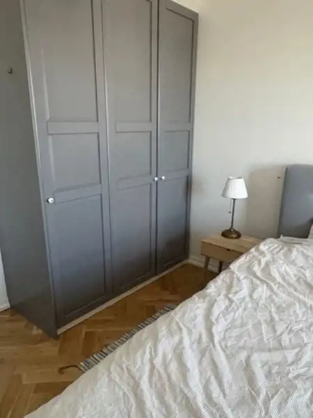 • Dwie sypialnie z szafami IKEA Loggia, na której położone są drewniane deski.