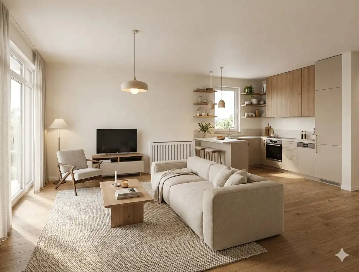 Salon z aneksem kuchennym (27,77 m2) – jasna, otwarta przestrzeń dzienna z wyjściem na przestronną loggię (7,95 m2), idealną do wypoczynku.