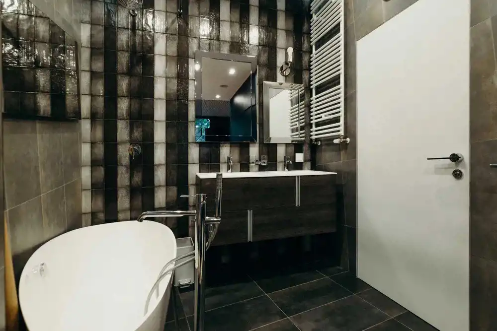 Wysokiej jakości podłogi: połączenie olejowanej deski dębowej z gresem, designerskie oświetlenie oraz wbudowane głośniki sufitowe.