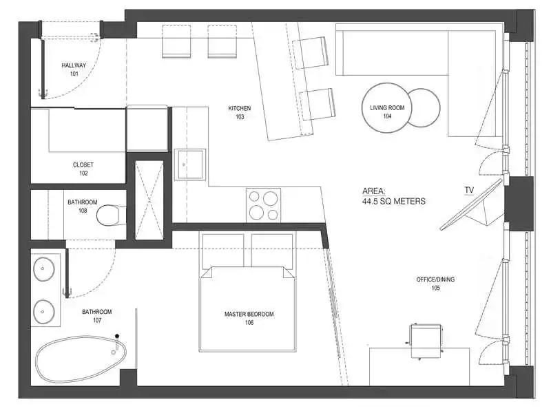 - Charakterystyka mieszkania 44.5 m2, 2 pokoje