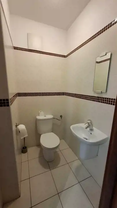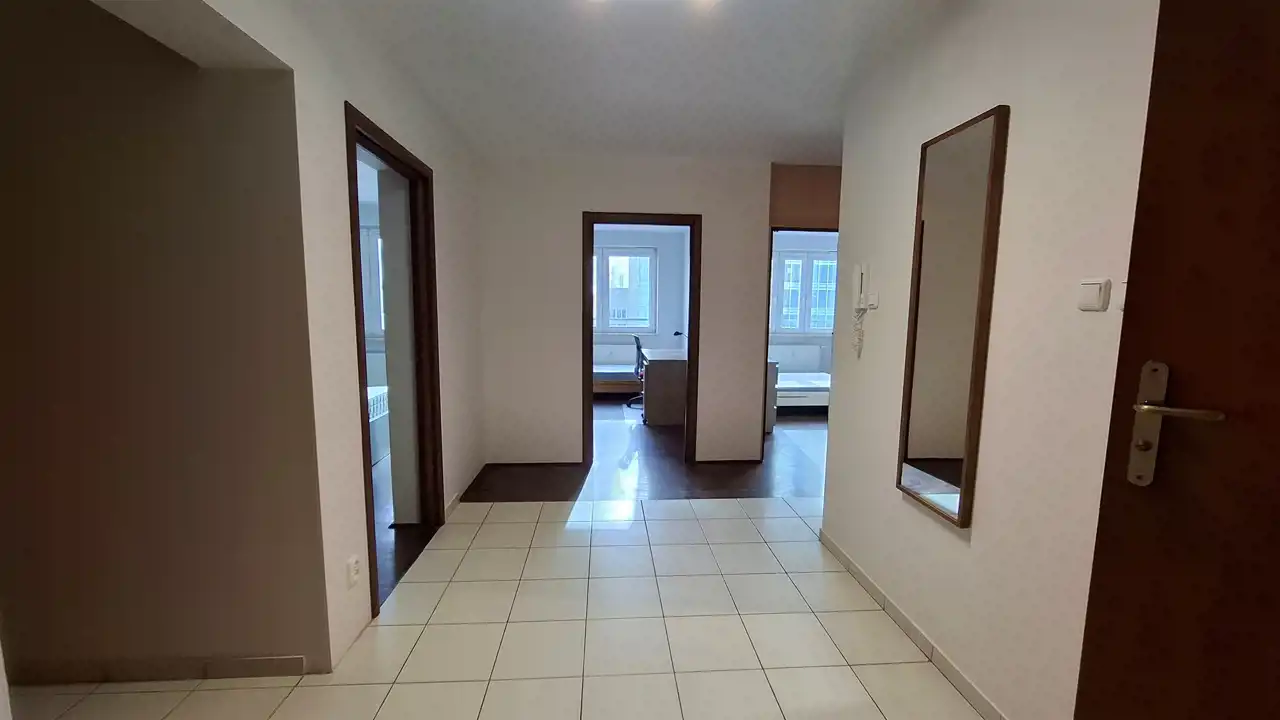 Wooden flooring in the rooms, stoneware tiles in the bathroom, hallway, and kitchen – good condition.
