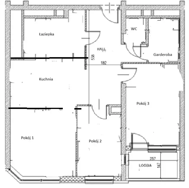 - 3 pokoje (jeden można połączyć z kuchnią, pierwotnie w planie nie było ścianki), w 2 pokojach szafy wnękowe.