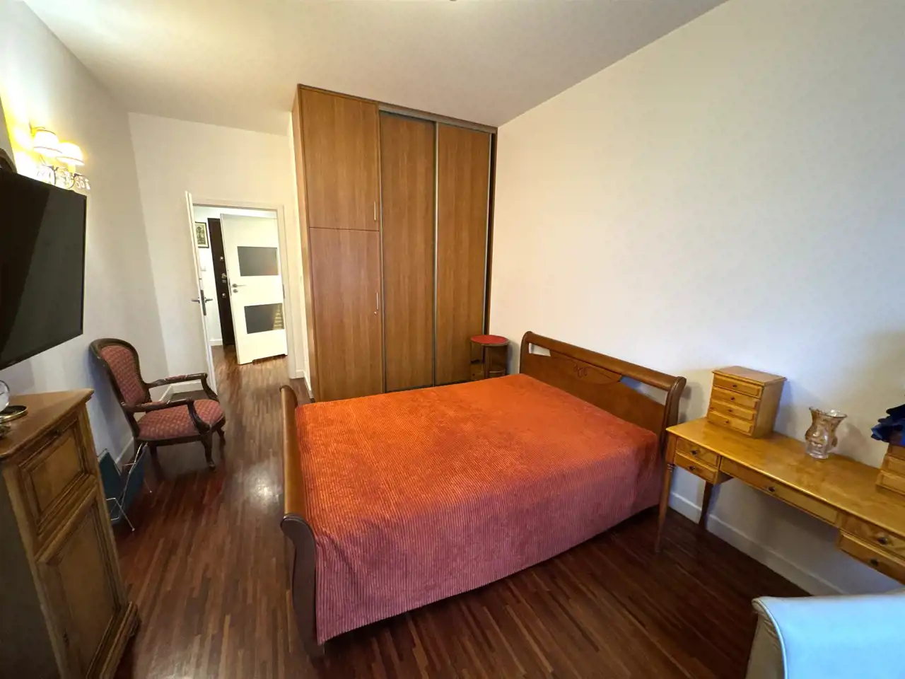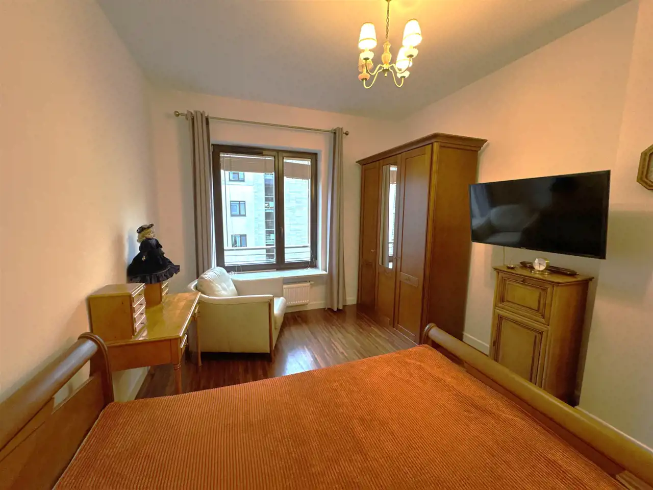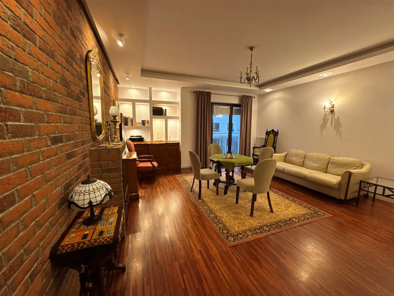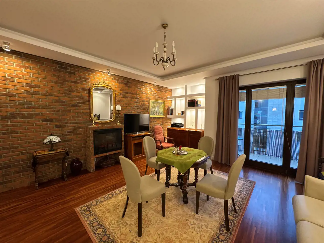 Mieszkanie bardzo ładnie urządzone, klimatyczny salon z kominkiem. Duży balkon, kuchnia częściowo otwarta na salon. Duża i ustawna sypialnia. Na podłodze w pokojach drewniany parkiet.
