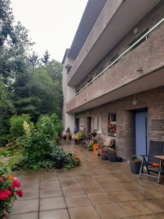 Na dole kamienicy jest wspólnie zagospodarowana przestrzeń.