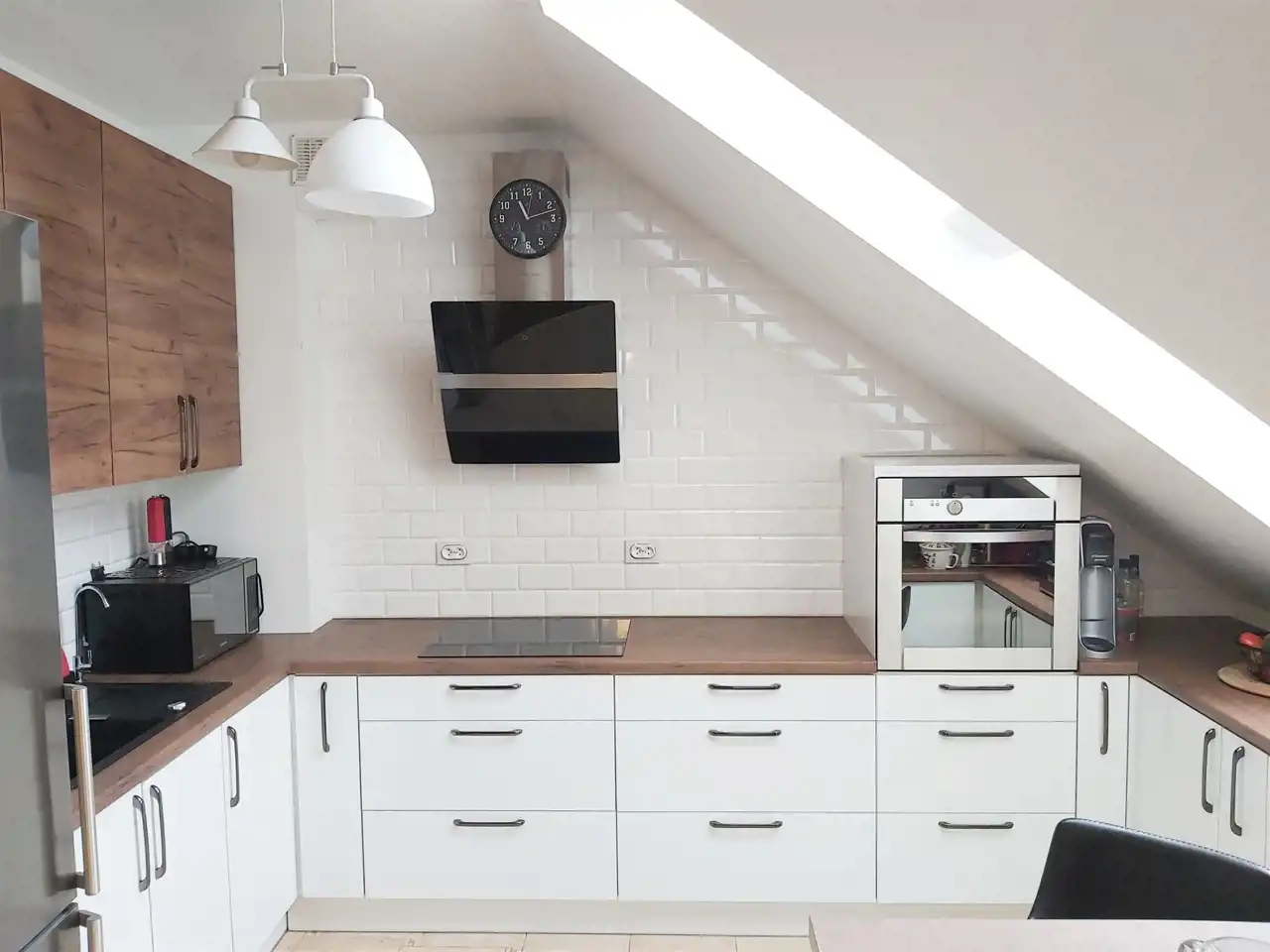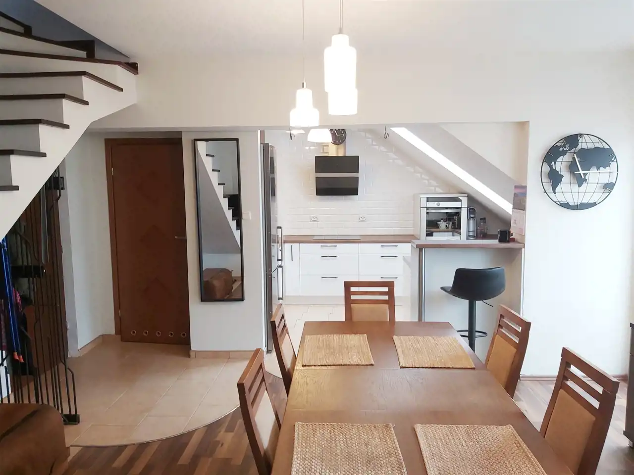Na pierwszym poziomie znajduje się: pokój dzienny z otwartą kuchnią i WC,