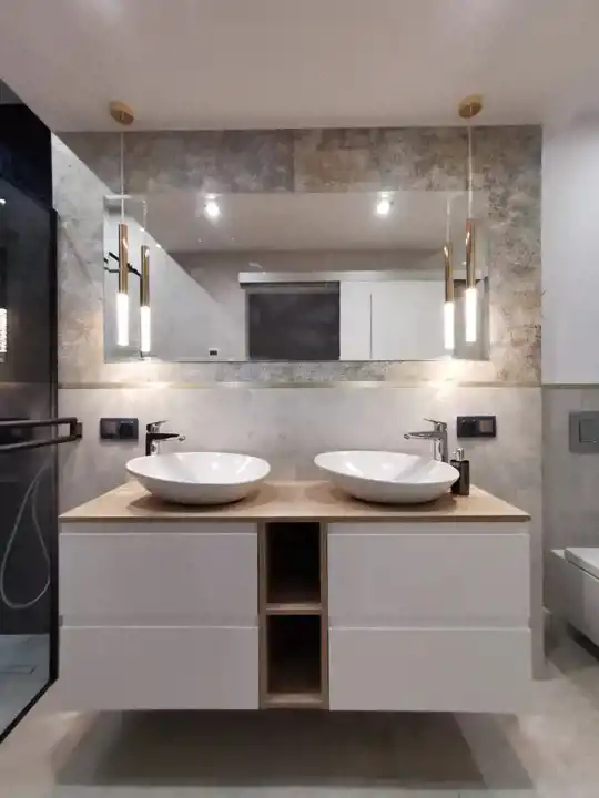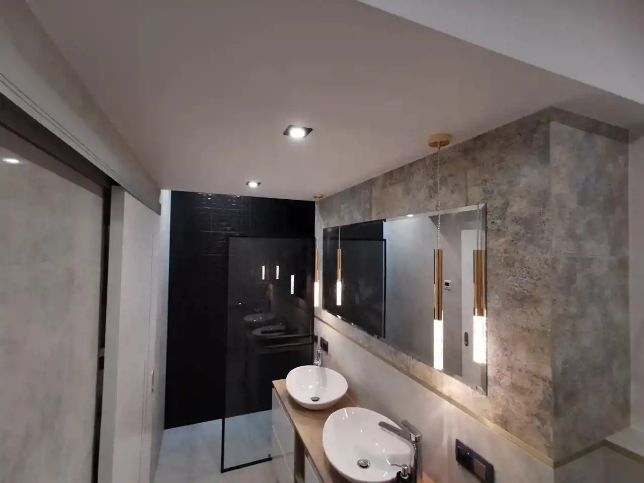 Duża łazienka z prysznicem, wanną oraz dwiema umywalkami.
