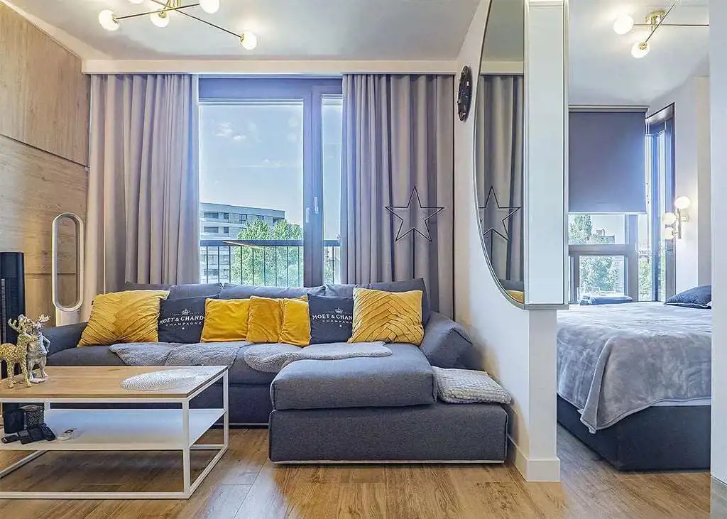 ROZKŁAD: salon z aneksem kuchennym, sypialnia, korytarz, łazienka z toaletą.