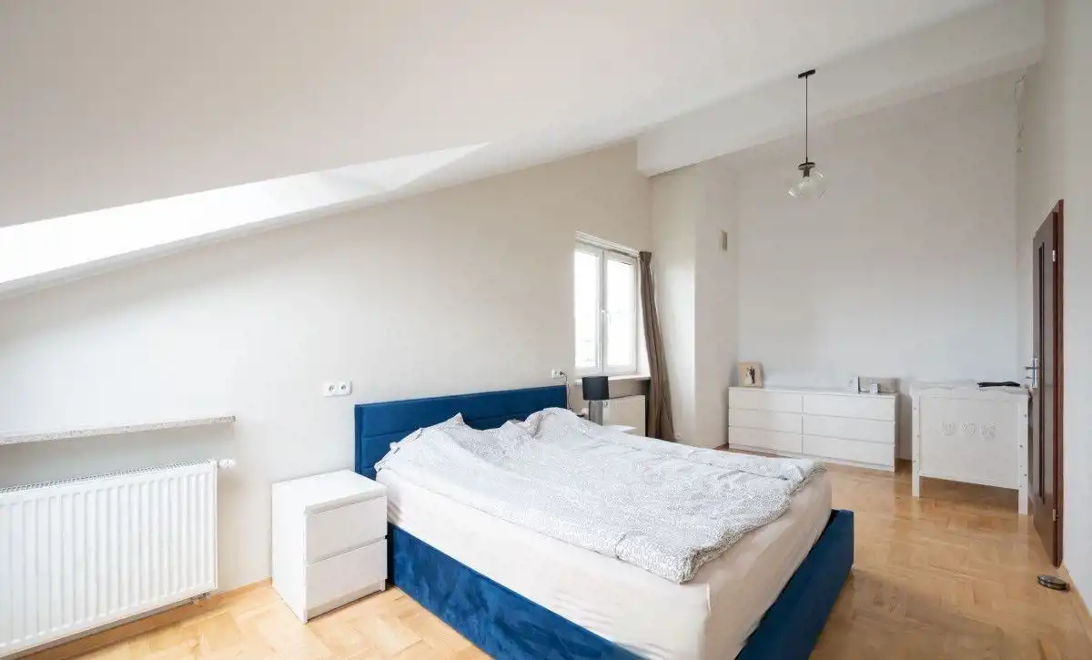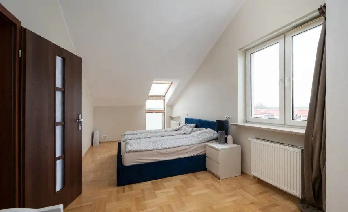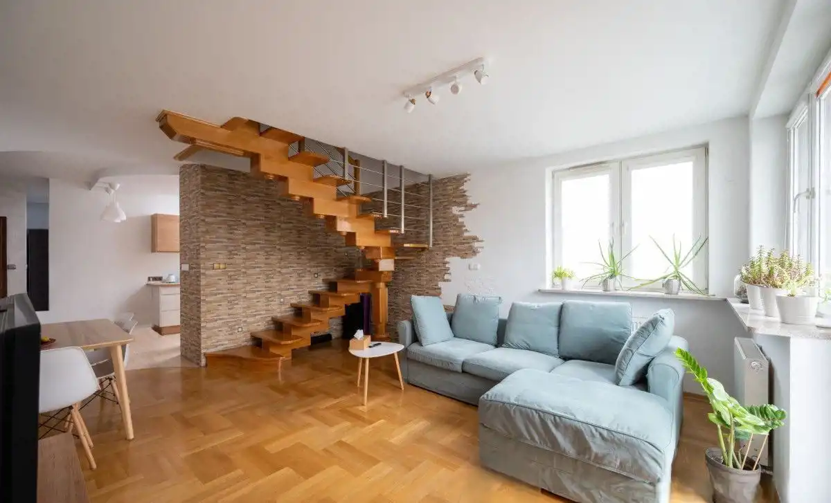 Dwupoziomowy lokal mieszkalny składający się z 4 pokoi, kuchni, 2 łazienek, garderoby i przedpokoju o łącznej powierzchni użytkowej 104,35 m². Balkon 6 m².