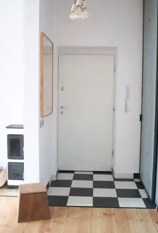 Przy wejściu w holu znajduje się bardzo duża wbudowana szafa z metalowymi drzwiami przesuwnymi w stylu industrialnym.