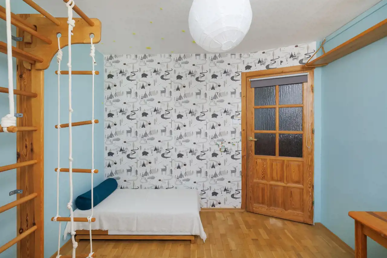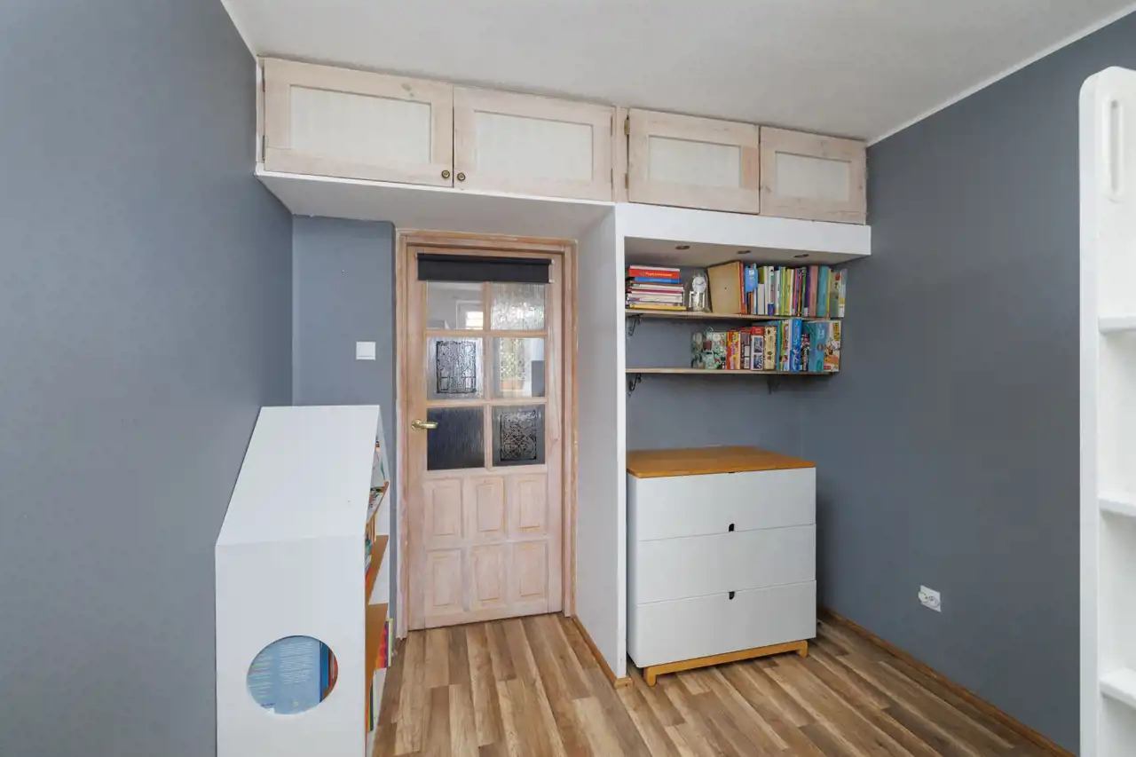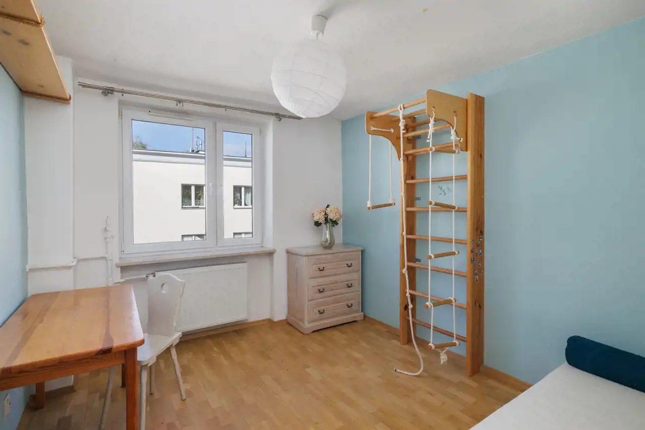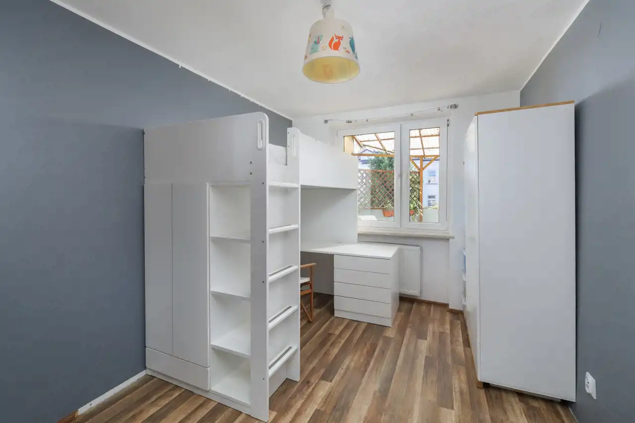 Pokój II (ok. 11,1 m2) – również z ekspozycją południową, obecnie urządzony jako pokój dziecięcy. Jego ustawny kształt i dostęp do światła dziennego sprawiają, że równie dobrze sprawdzi się jako dodatkowa sypialnia albo wygodne miejsce do pracy.